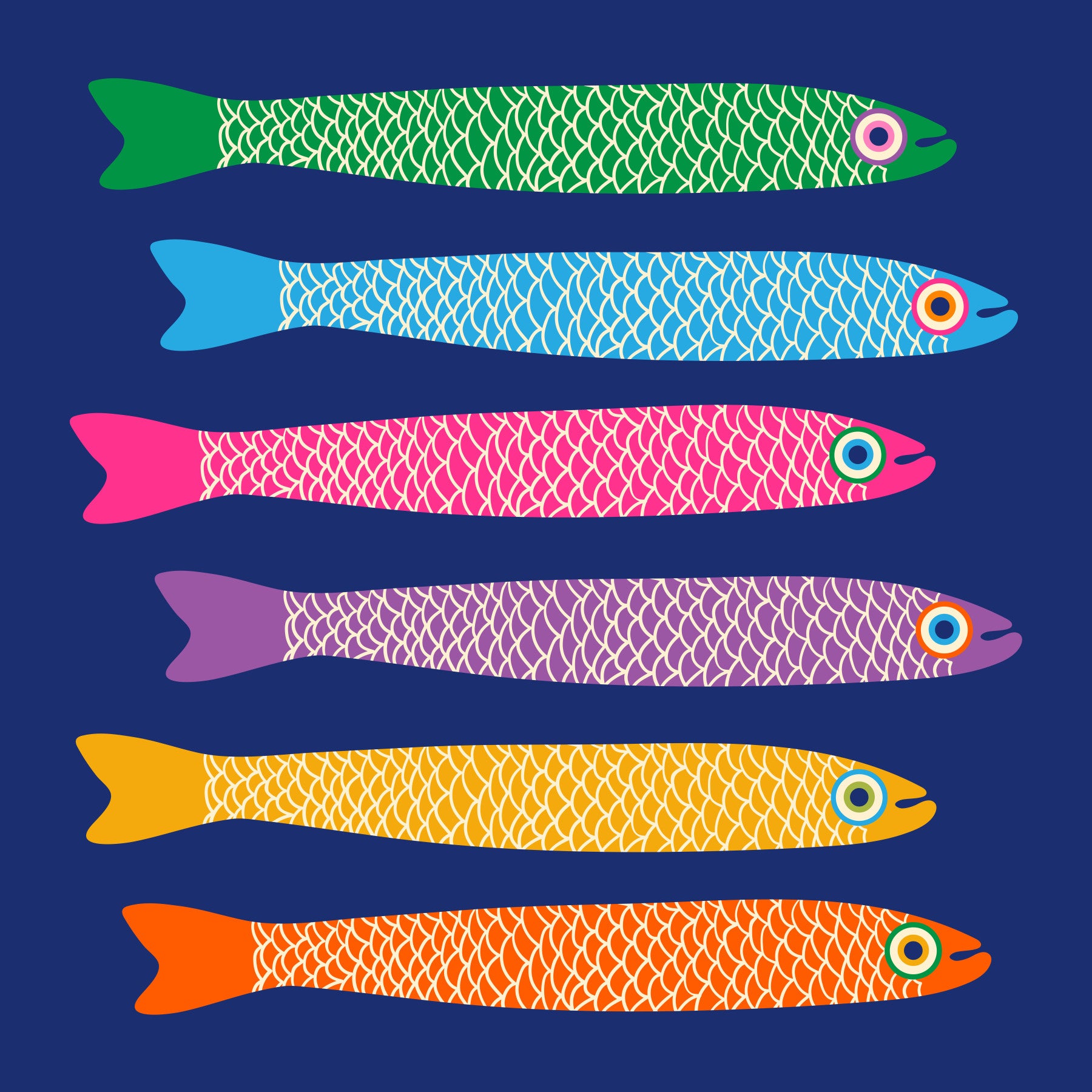 Dive into a vibrant underwater world with this captivating wallpaper! Six stylized anchovies, each a burst of bright rainbow hues – green, blue, pink, purple, yellow, and orange – swim against a rich royal blue backdrop. Their scales shimmer with a playful, hand-drawn pattern, and their large, colorful eyes add a touch of whimsical charm. This bold and cheerful design brings a burst of energy and optimism to any space, perfect for adding a pop of color to your walls. This wall mural design is also available in Other Colourways AND in a repeat wallpaper version too! Original wallpaper pattern design by Jackie Tahara of UnBlink Studio.