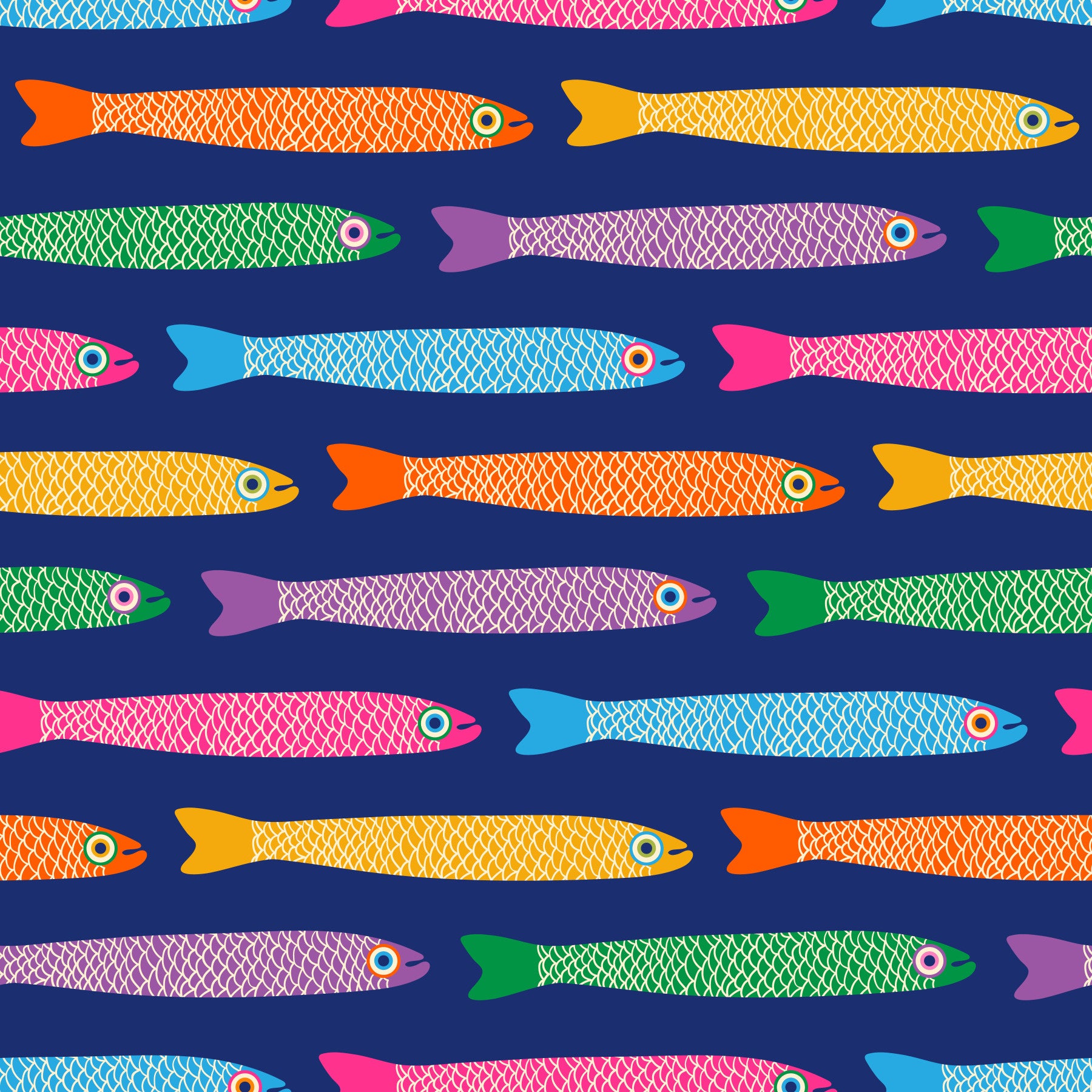 Dive into a vibrant underwater world with this captivating wallpaper! A school of stylized anchovies, each boasting a unique bright rainbow hue, swim playfully against a rich royal blue backdrop. Their scales shimmer with intricate white detailing, adding a touch of elegance to their cheerful design. The bold colors and playful composition create a fun, energetic atmosphere, perfect for adding a splash of joyful vibrancy to any room. This whimsical pattern is sure to brighten your day and infuse your space with a sense of underwater adventure. This pattern design is also available in Other Colourways AND in a wall mural version too! Original wallpaper pattern design by Jackie Tahara of UnBlink Studio.