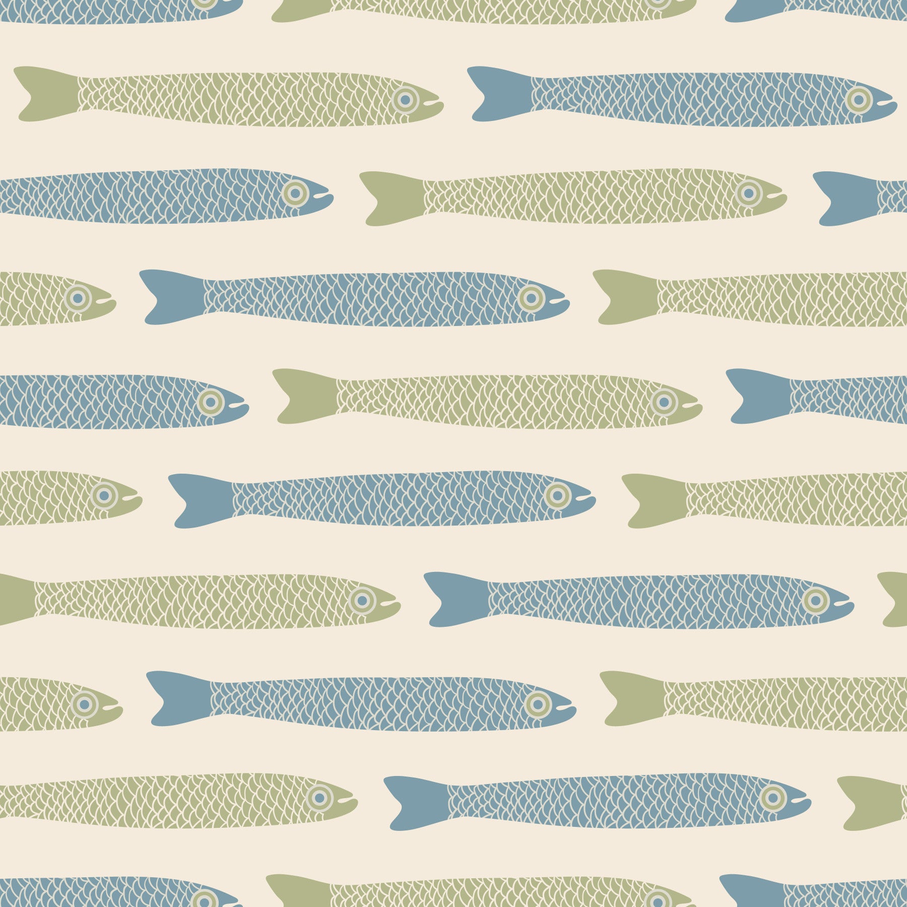Anchovies Retro Blue Sage Green Fish on Cream Wallpaper⁠