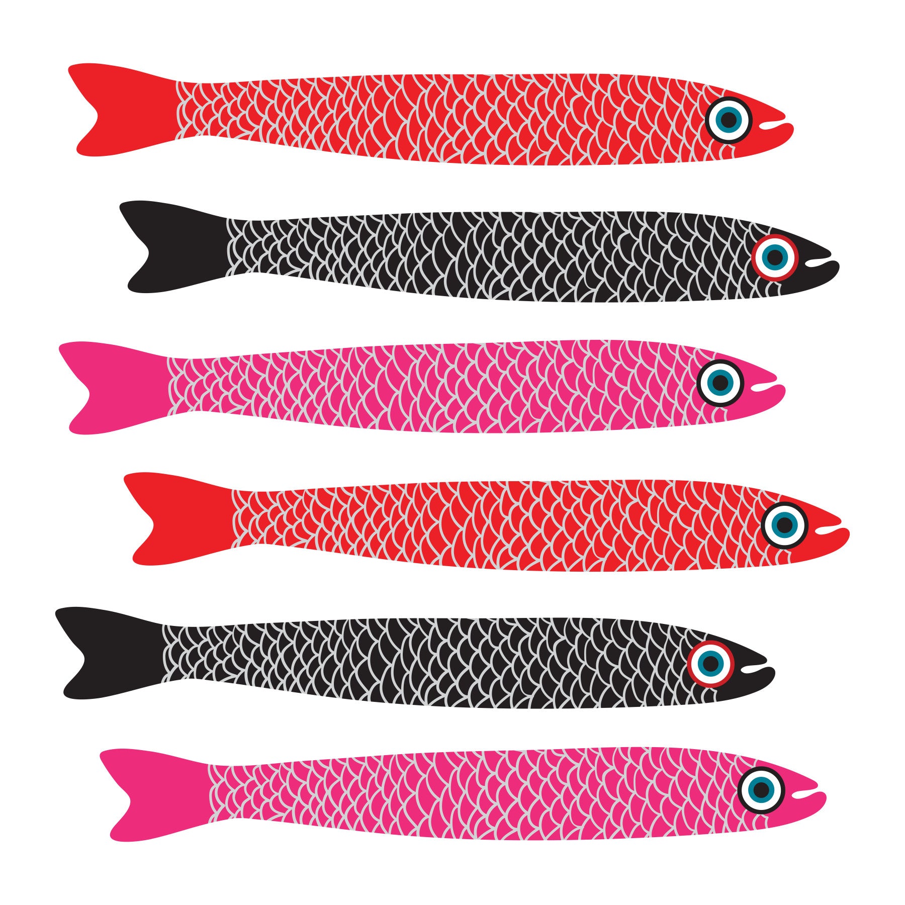 Dive into a graphic whimsical world with this Anchovies wall mural, featuring a school of stylized fish in vibrant shades of red, delightful fuchsia hot pink, and bold charcoal black on a crisp white background. Each fish is rendered in a charming retro style, creating a visually striking and playful design. This wall mural is eye-catching and dramatic without being overwhelming, making it a perfect choice for adding a touch of quirky sophistication to your walls. Let these retro anchovies add a splash of bold color and vintage charm to your daily life! This wall mural design is also available in Other Colourways AND in a repeat wallpaper version too! Original wall mural design by Jackie Tahara of UnBlink Studio.