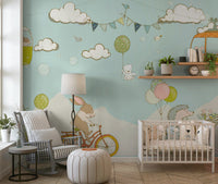 Let your imagination soar with this charming wallpaper for walls. Featuring whimsical animals on bikes and in gondolas, this design evokes a sense of carefree adventure. Birds flutter among puffy clouds and festive bunting against a soft blue backdrop. The playful colour palette and hand-drawn style create a cheerful ambience perfect for a kids' room or nursery. This design complements interiors seeking a lighthearted and imaginative touch.