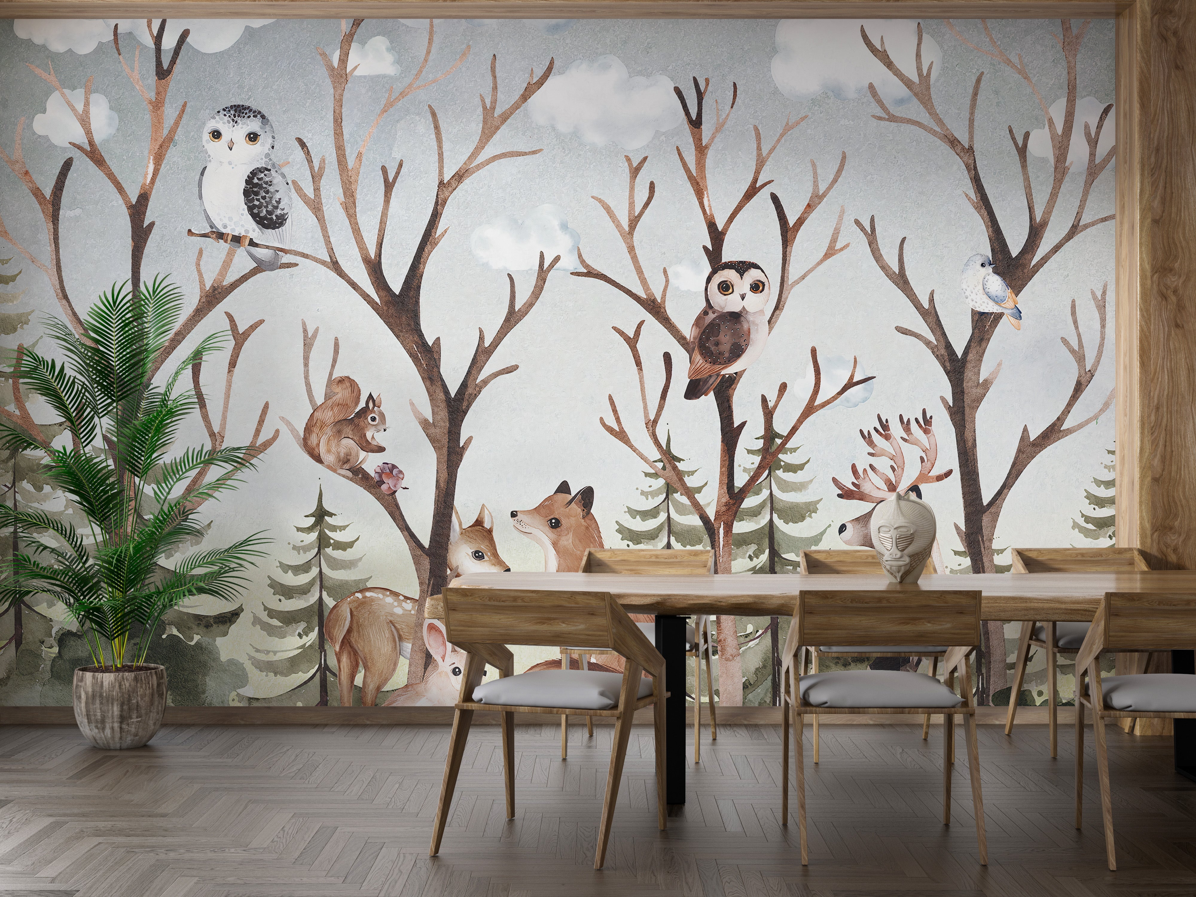 Step into the world of the great outdoors with a pinch of enchantment. Create a playground of imagination with an autumn jungle adventure mural wallpaper. Transform your empty room into a lively play area with playful fox wallpaper, cute owl wallpaper, and adorable rabbit wallpaper. You'll be amazed at how subtle changes can spark creativity and create a joyous environment. Witness an exotic paradise unfold as your kids play around, surrounded by the colorful wildlife that has found its way onto your wall. Bring imagination to life with this awe-inspiring mural wallpaper.