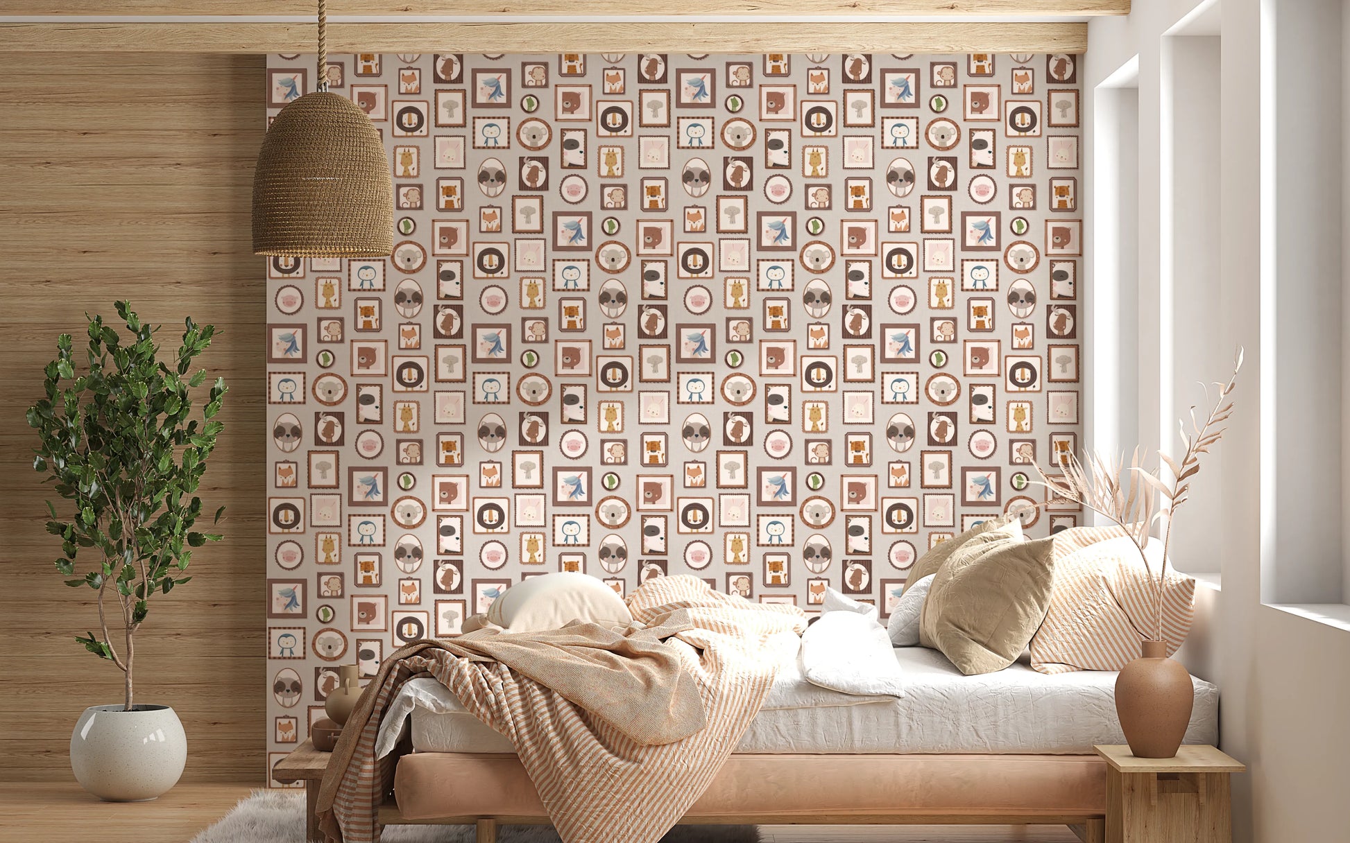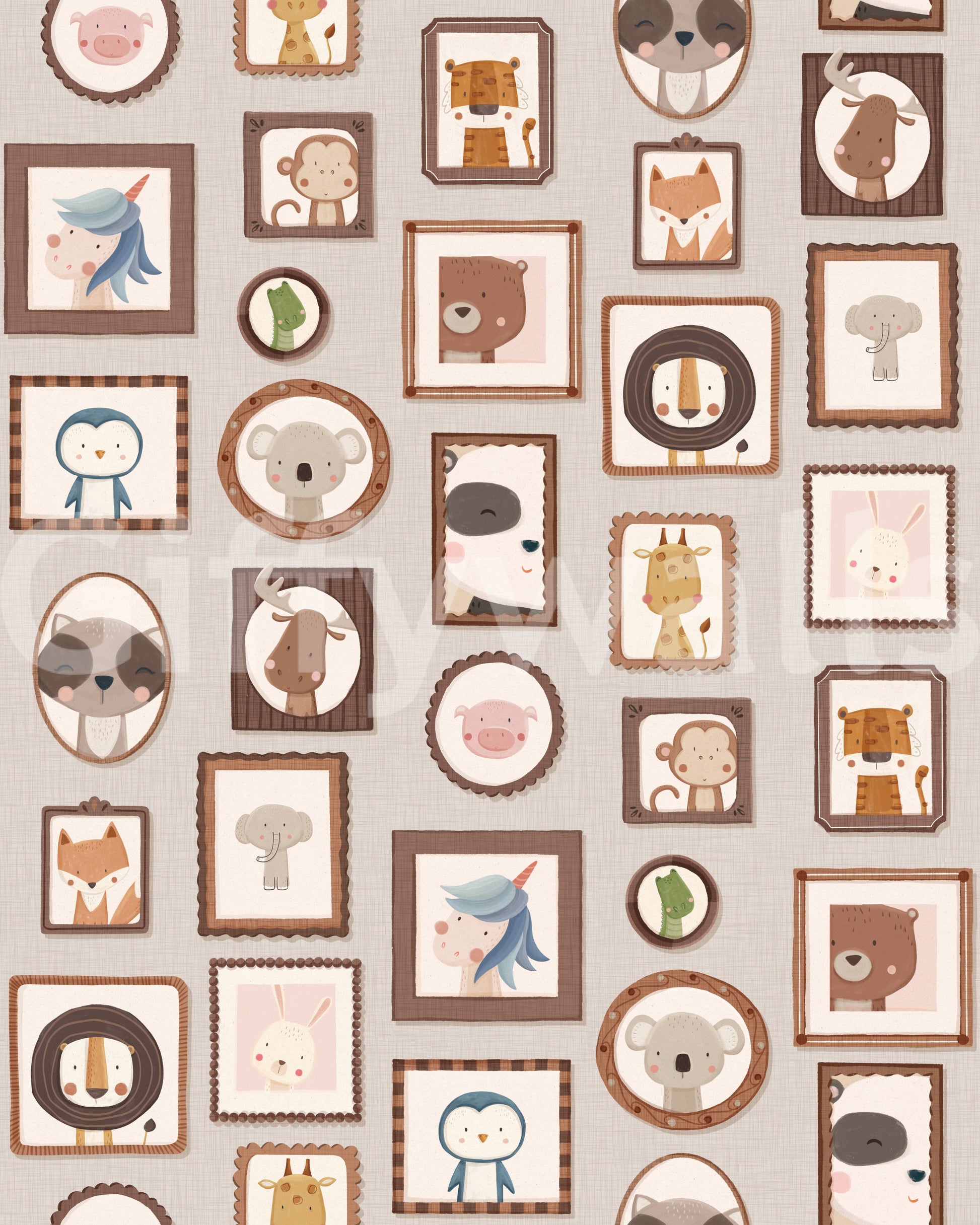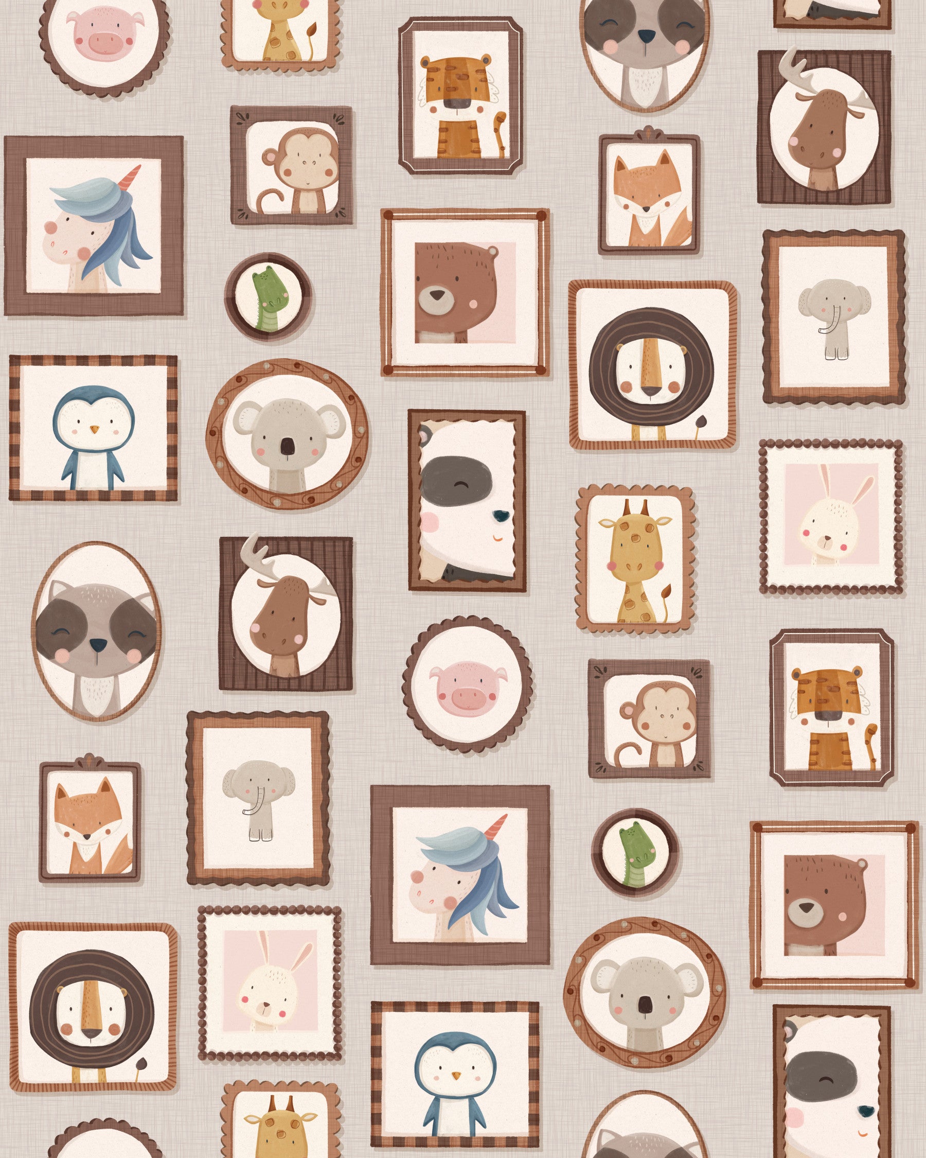 Create a whimsical and heartwarming gallery directly on your walls with this delightful wallpaper for walls. The pattern showcases a series of endearing animal illustrations, lovingly displayed in a variety of decorative frames. The soft browns, creams, and subtle pastel hues evoke a cosy and welcoming ambience. This design transforms any room into a cheerful sanctuary, making it ideal for children's spaces, playrooms, or even a charming home office. The detailed artwork and engaging characters add personality and invite imagination into your interior space. Let this animal gallery bring smiles to everyone who enters the room.