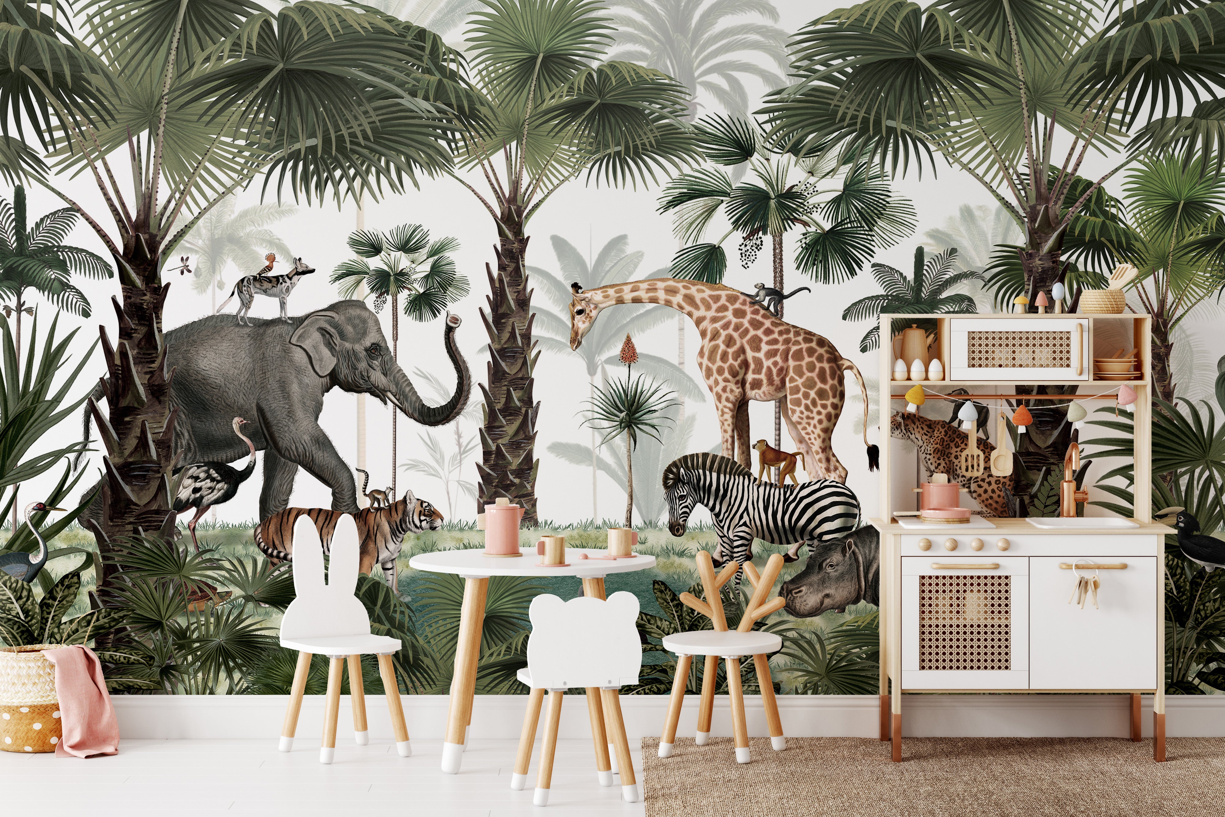 This wildlife animal kingdom wallpaper mural is a safari-themed inspiration for kids rooms, nurseries and preschoolers.  The jovial animals add a charming display in vivid colors and fill the space with lively elements. It’s enchanting tropical-inspired motifs that raise the depth with nature’s freshness. Suitable for diverse statements, this wildlife whimsy creates a sanctuary inside your space and features an adorable animal kingdom with little adventure. It's an oasis for the room with vibrant colors and a delightful view. Made with high-quality papers, this product is eco-friendly and keeps the environment safe for kids as well as adults.
