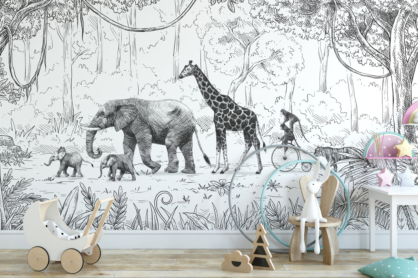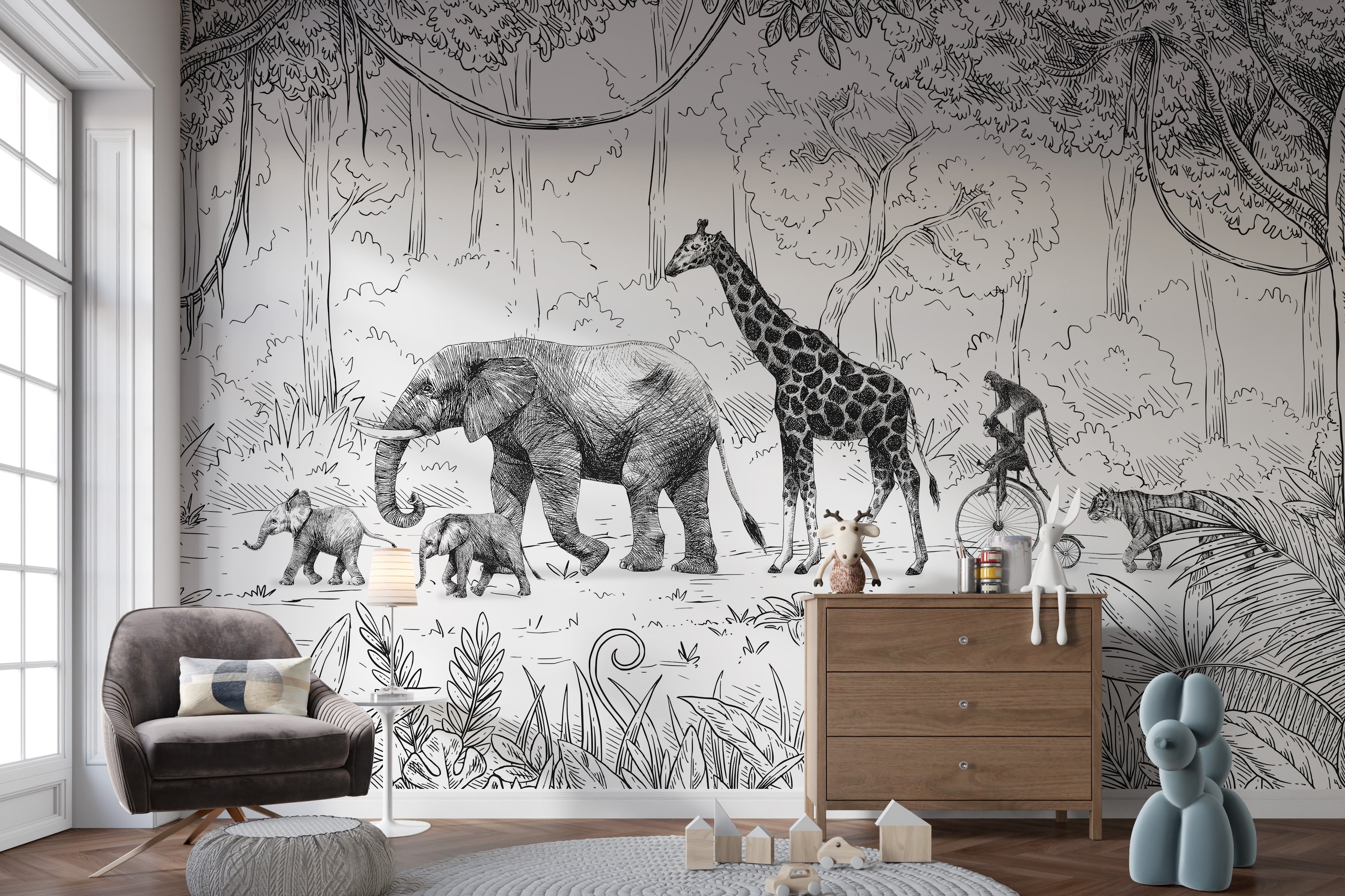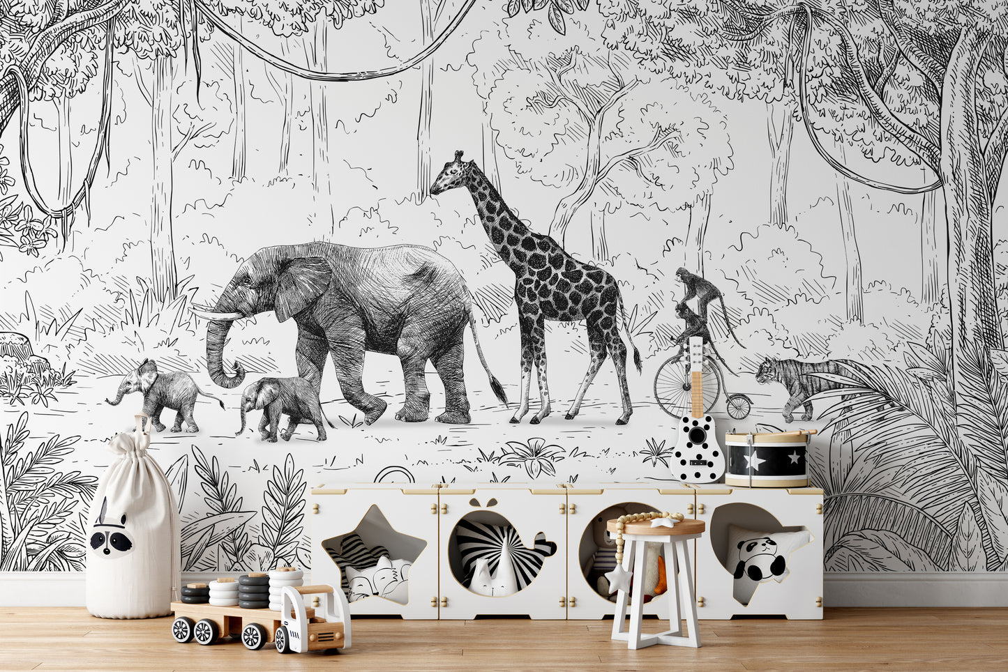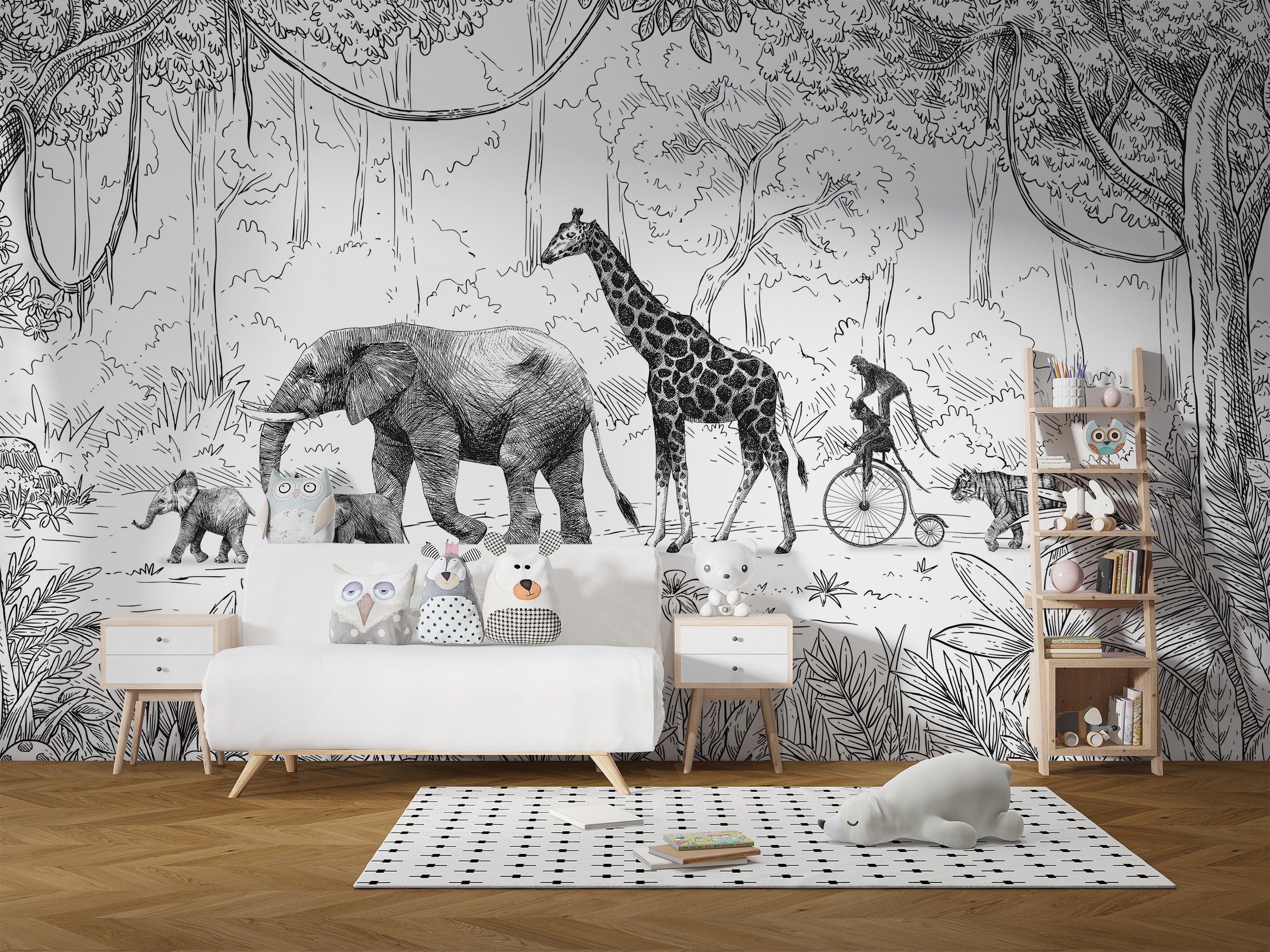 The animal parade black and white wall mural is a delightful addition to any kids room, featuring a charming parade of animals in a classic black-and-white design. This wallpaper is perfect for sparking your child's imagination and creating a playful environment. The intricate illustrations of elephants, giraffes, monkeys, and tigers will captivate your child, providing a backdrop that encourages creativity and fun. Whether used as an accent wall or to cover an entire room, this wallpaper is sure to be a favourite. Secure your Animal Parade Black and White kids room wallpaper today and bring a touch of whimsy to your child's space.
