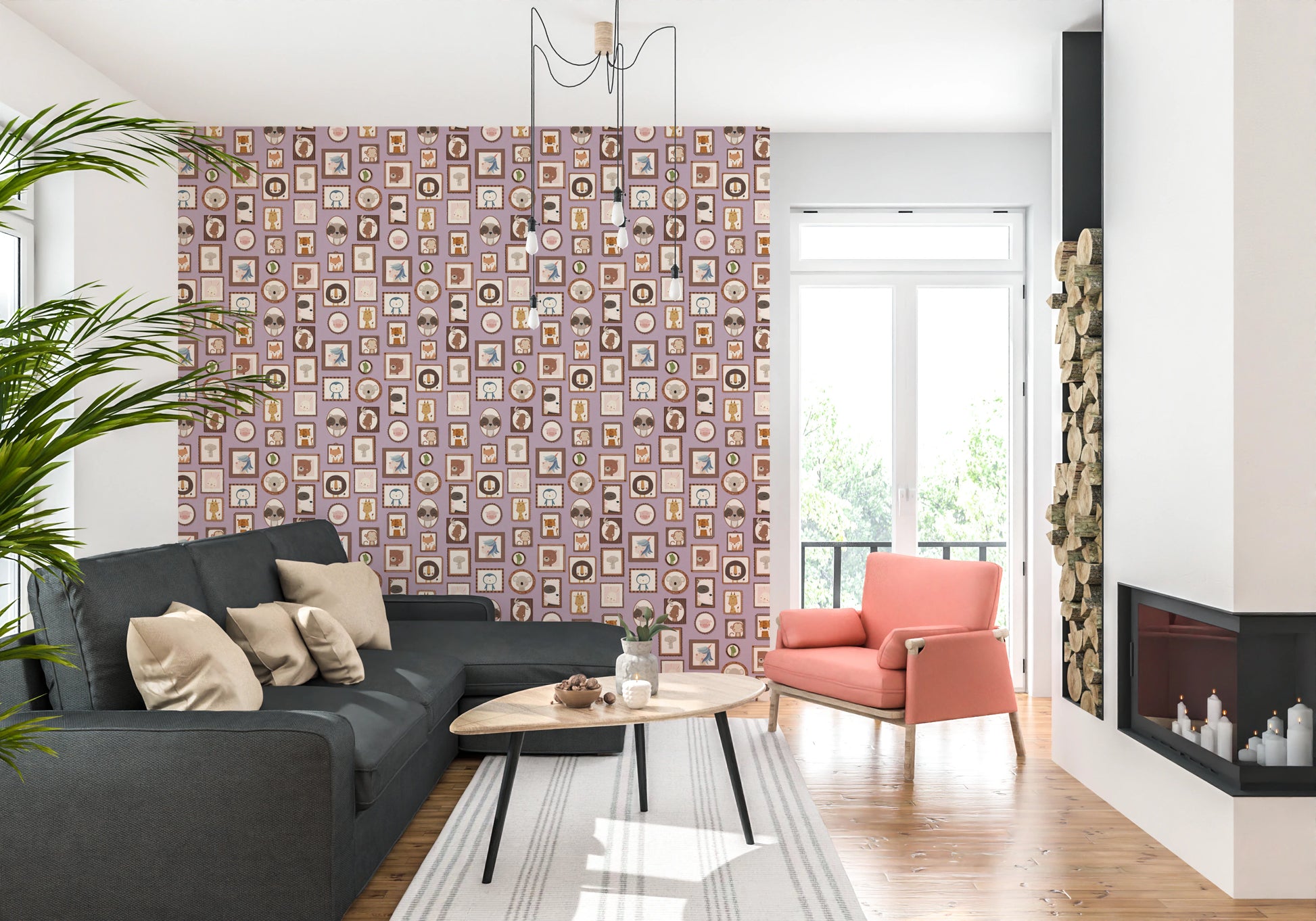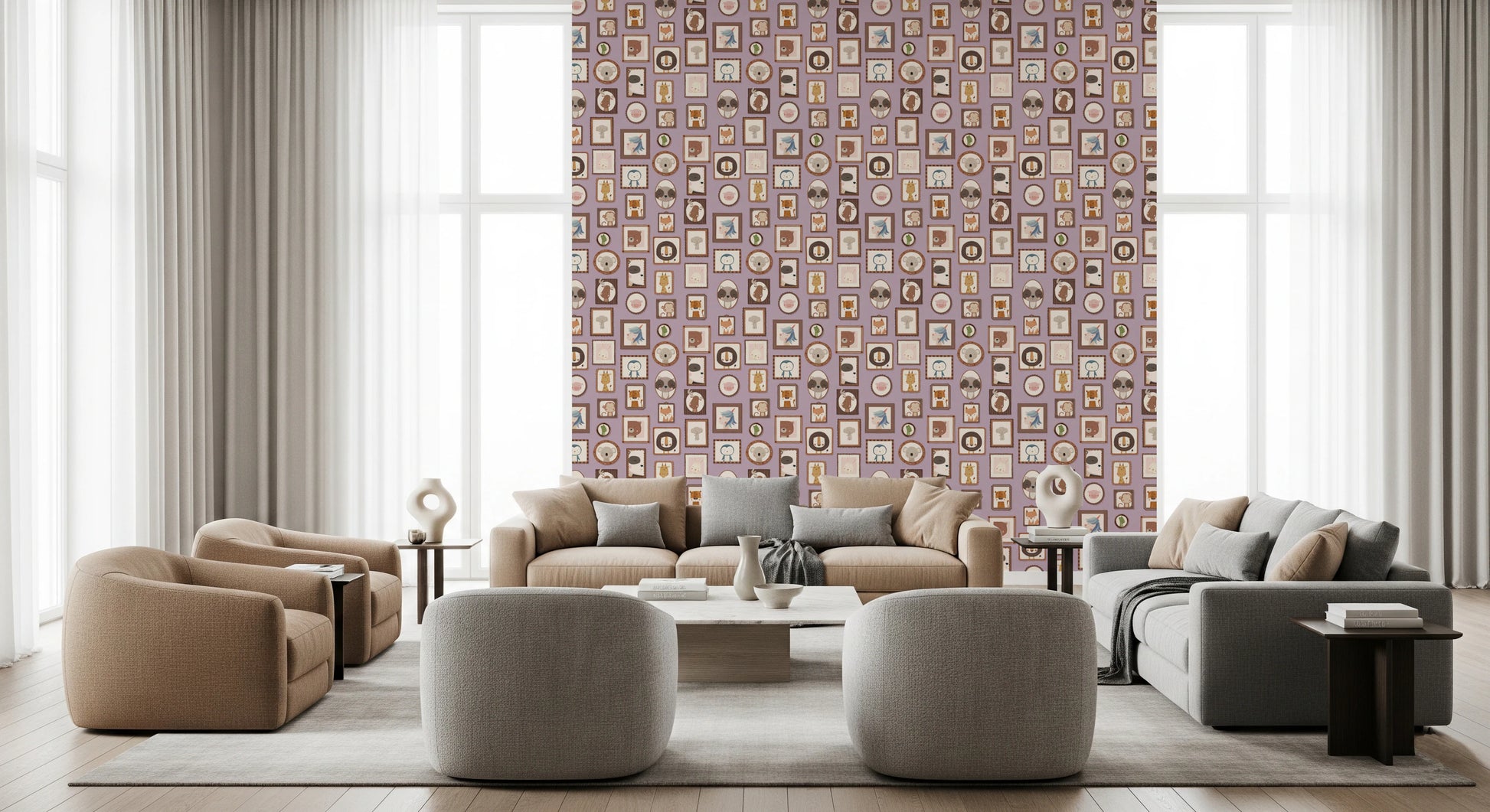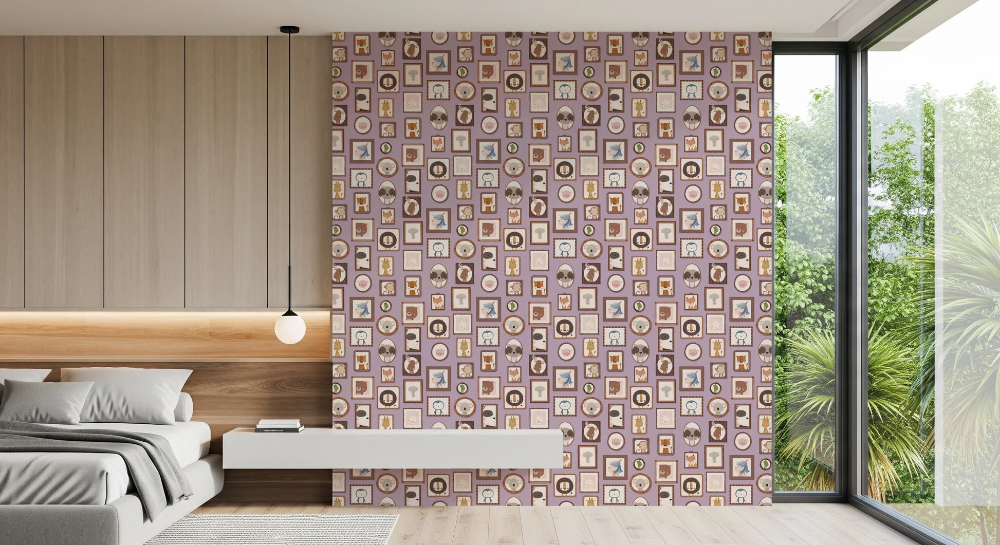 Transform your walls with this charming collection of framed animal portraits. The design showcases a variety of cute creatures, including lions, bears, penguins, and unicorns, each presented in a unique, decorative frame. The soft colour palette of lilac, beige, and brown creates a calming and inviting atmosphere. This wallpaper for walls is ideal for kids' rooms, nurseries, or playrooms. It adds a touch of whimsy and sophistication while enhancing the overall décor with its adorable characters and delightful arrangement. Instantly create a cosy and playful space.