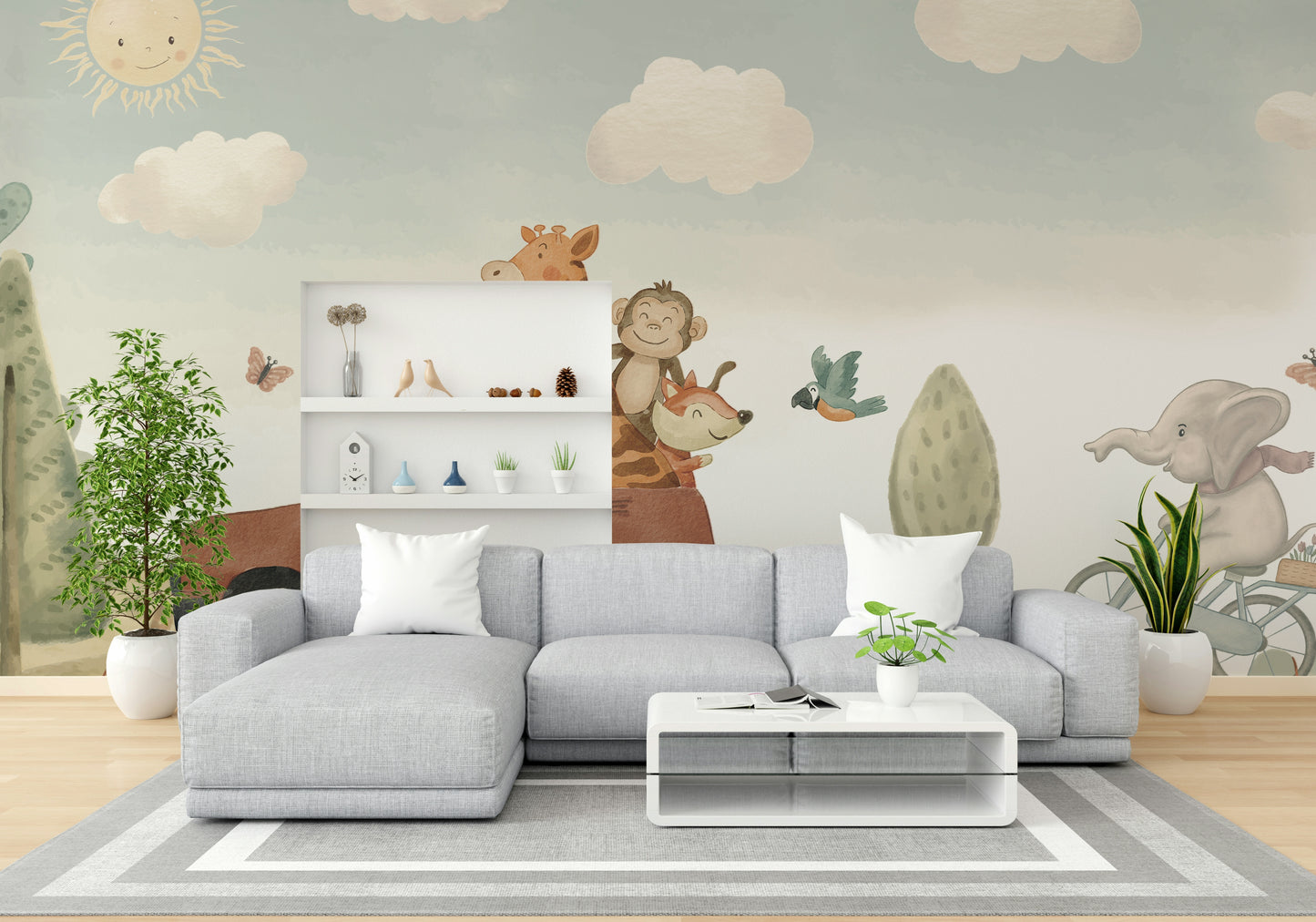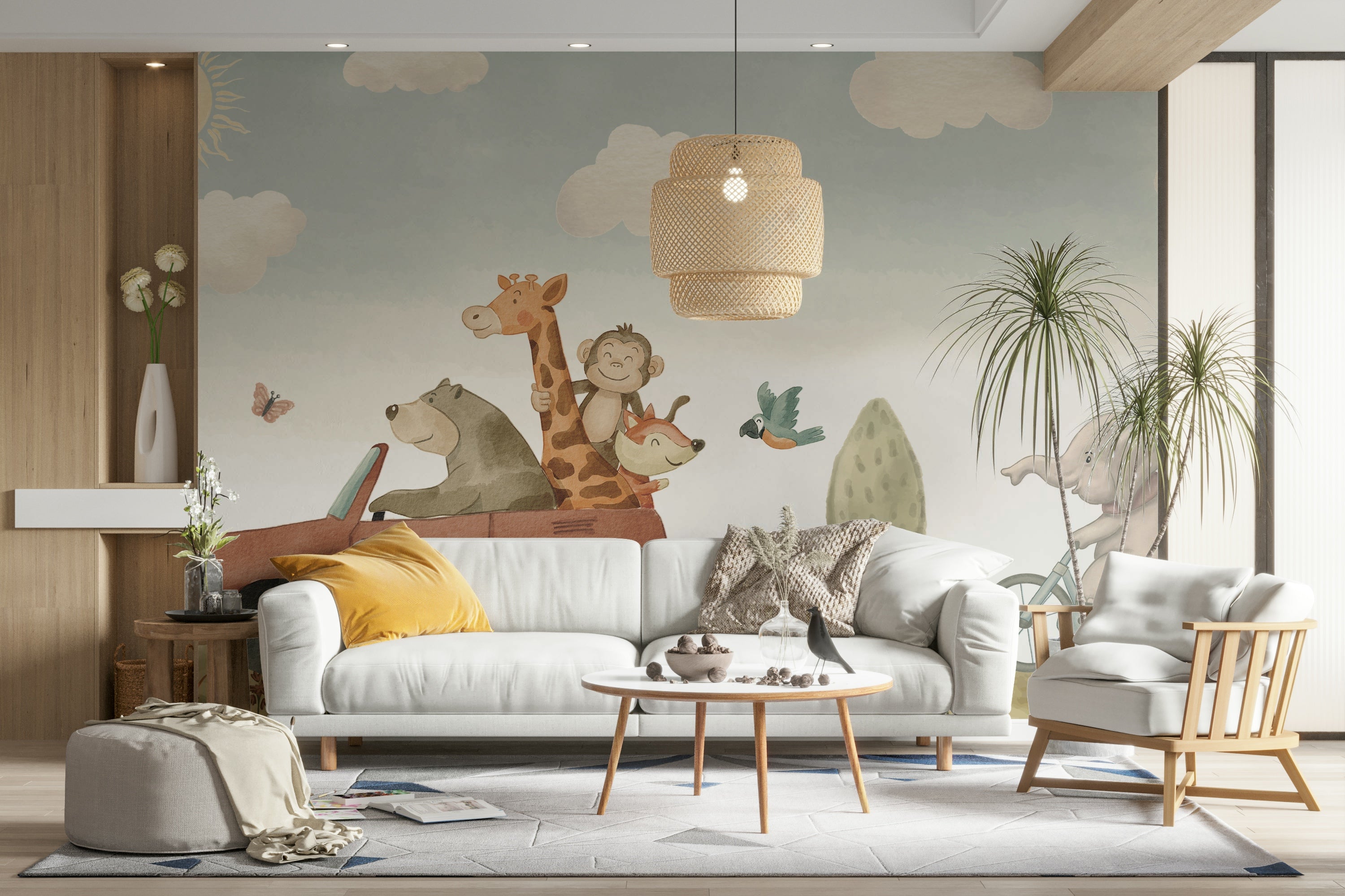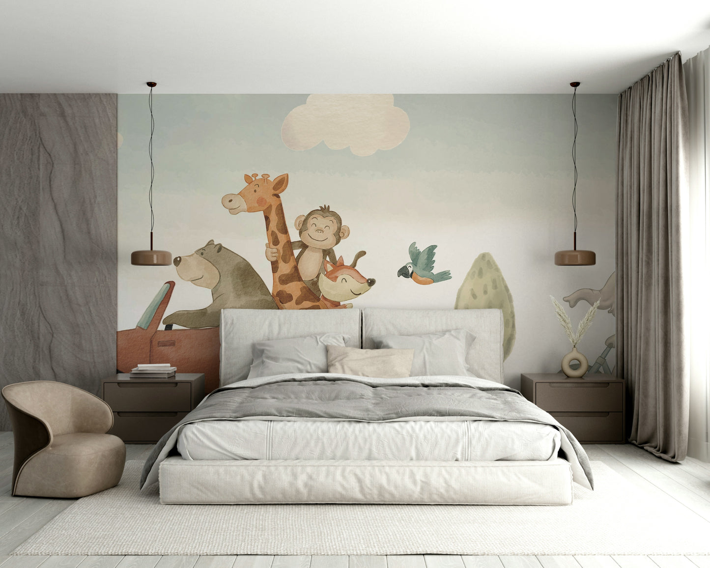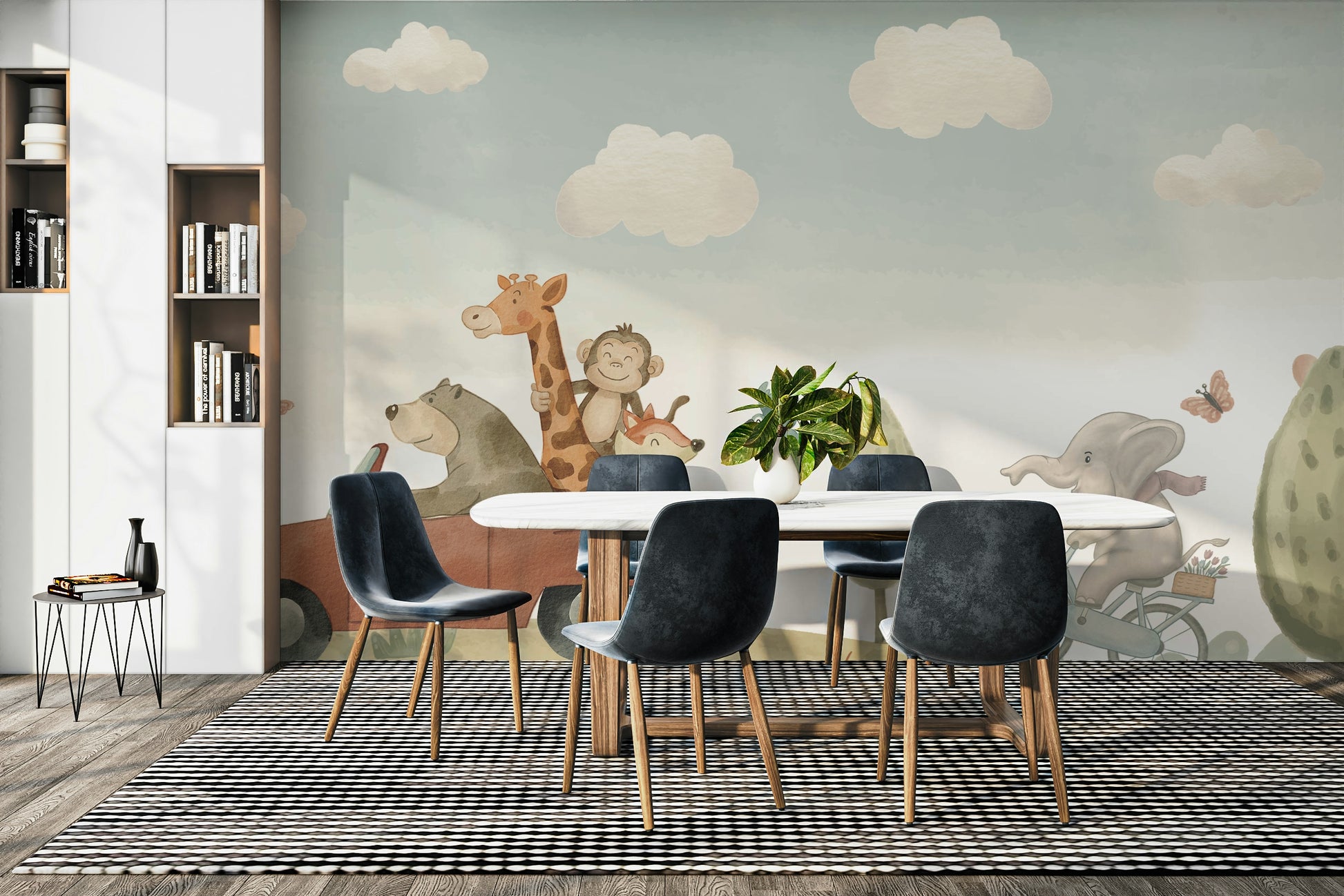 Embark on a charming animal road trip wallpaper adventure with this delightful design! A watercolor-style illustration showcases a group of adorable animals embarking on a scenic journey. A bear, giraffe, monkey, and fox are happily crammed into a quaint red car, while an elephant cycles alongside, a flower basket perched on its bike. This playful animal-themed wallpaper brings storytelling to life, making it an ideal choice for kids’ rooms and nurseries. The soft color palette and delicate brushstrokes create a peaceful atmosphere, while the whimsical animal characters add a touch of joy and imagination. Whether you're decorating a children’s bedroom or looking for a travel-themed kids wallpaper, this design captures the spirit of adventure and friendship. The charming details, such as butterflies and grassy landscapes, enhance the feeling of a storybook mural, perfect for a nursery wall or educational play space. Plus, available in peel and stick animal wallpaper format, it offers an easy update without the mess.