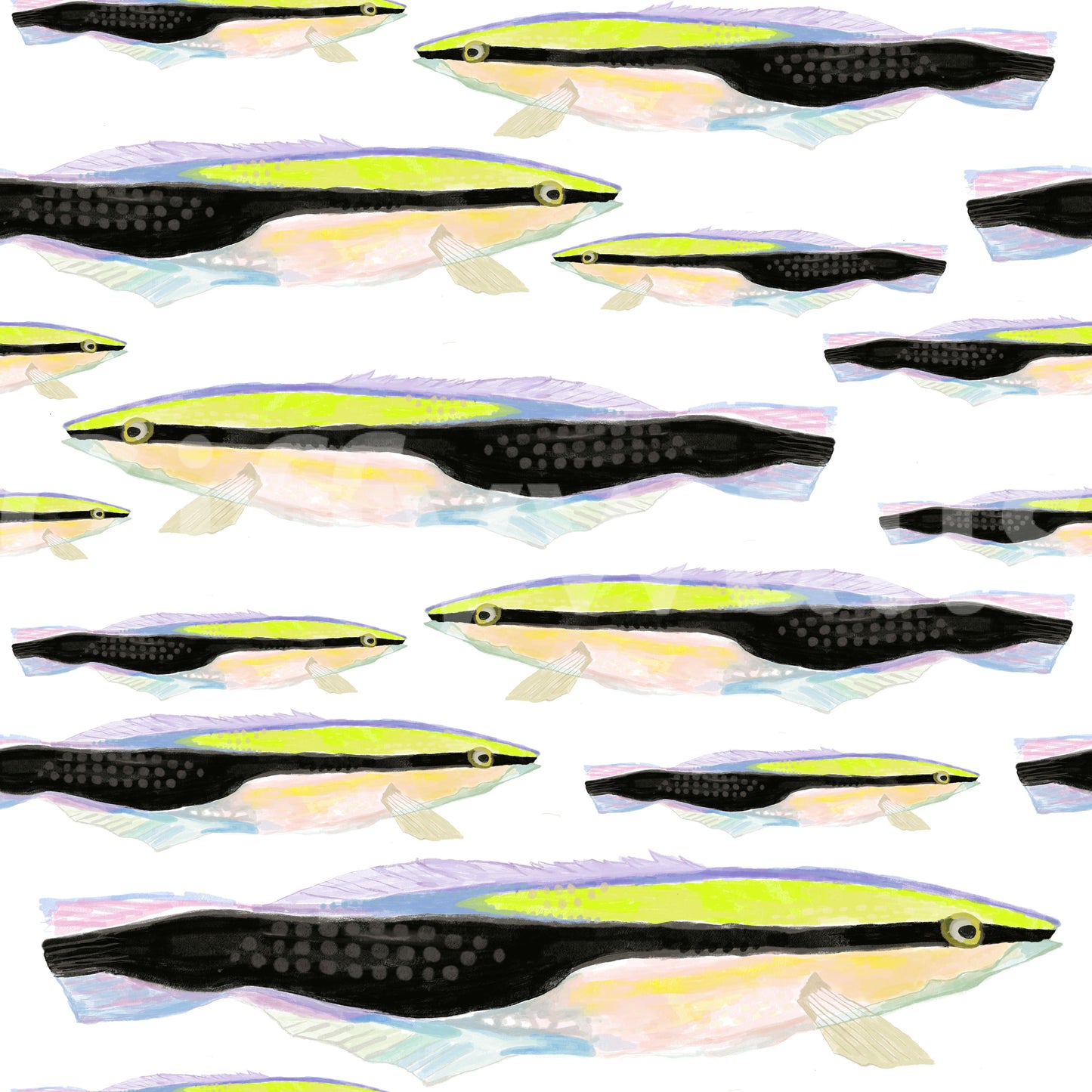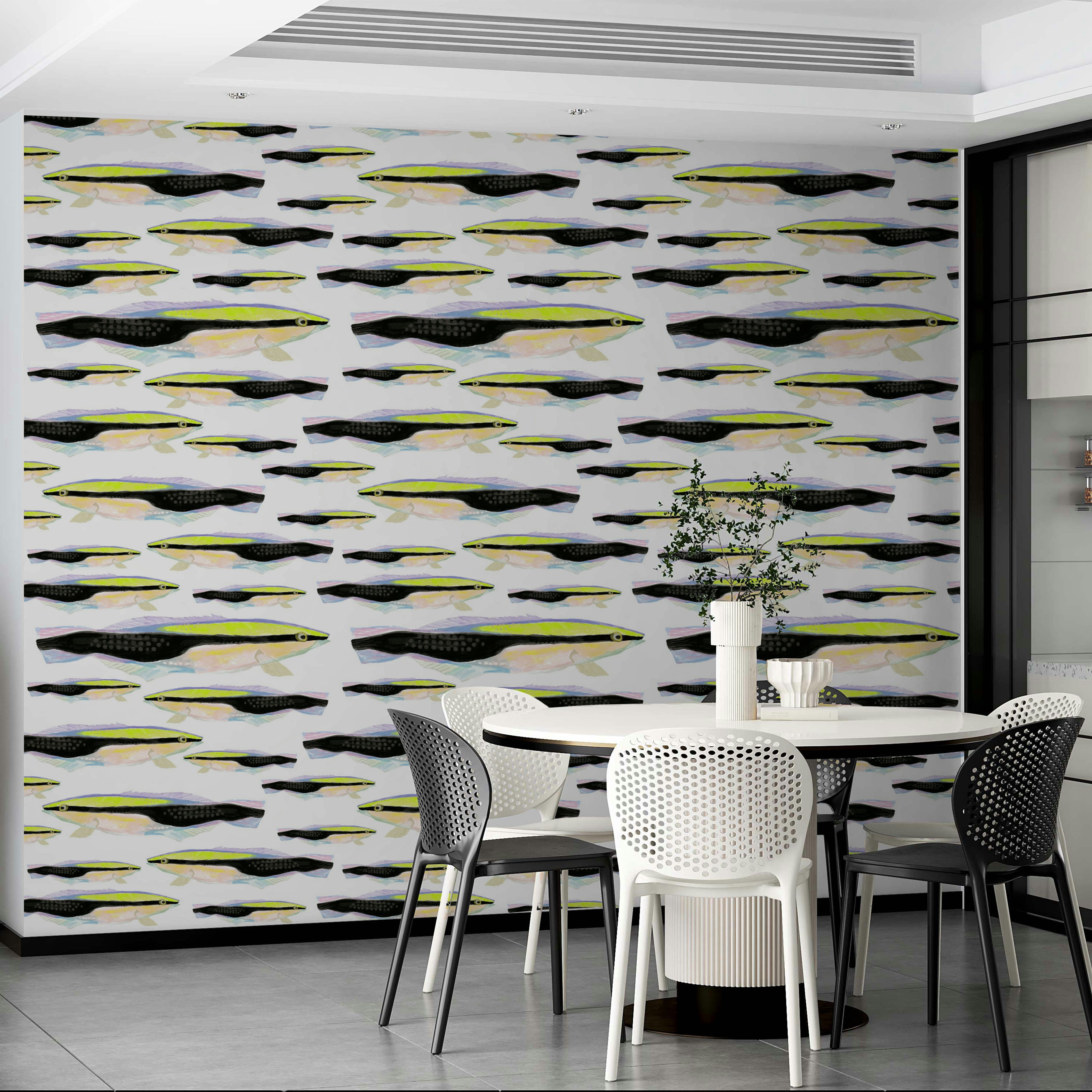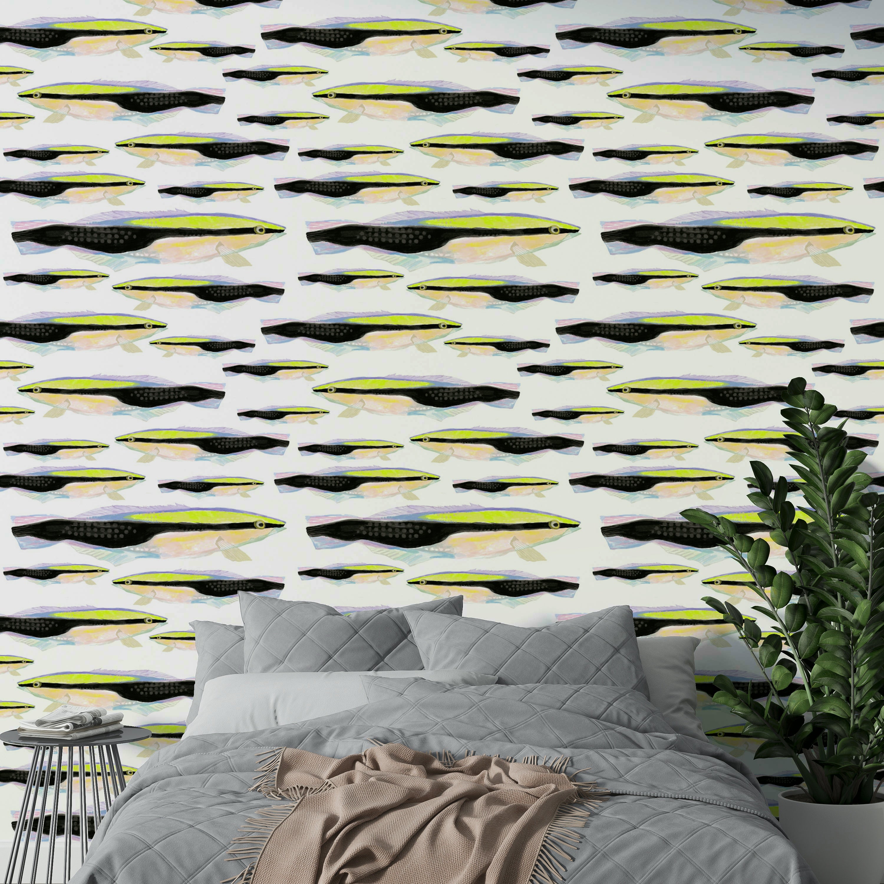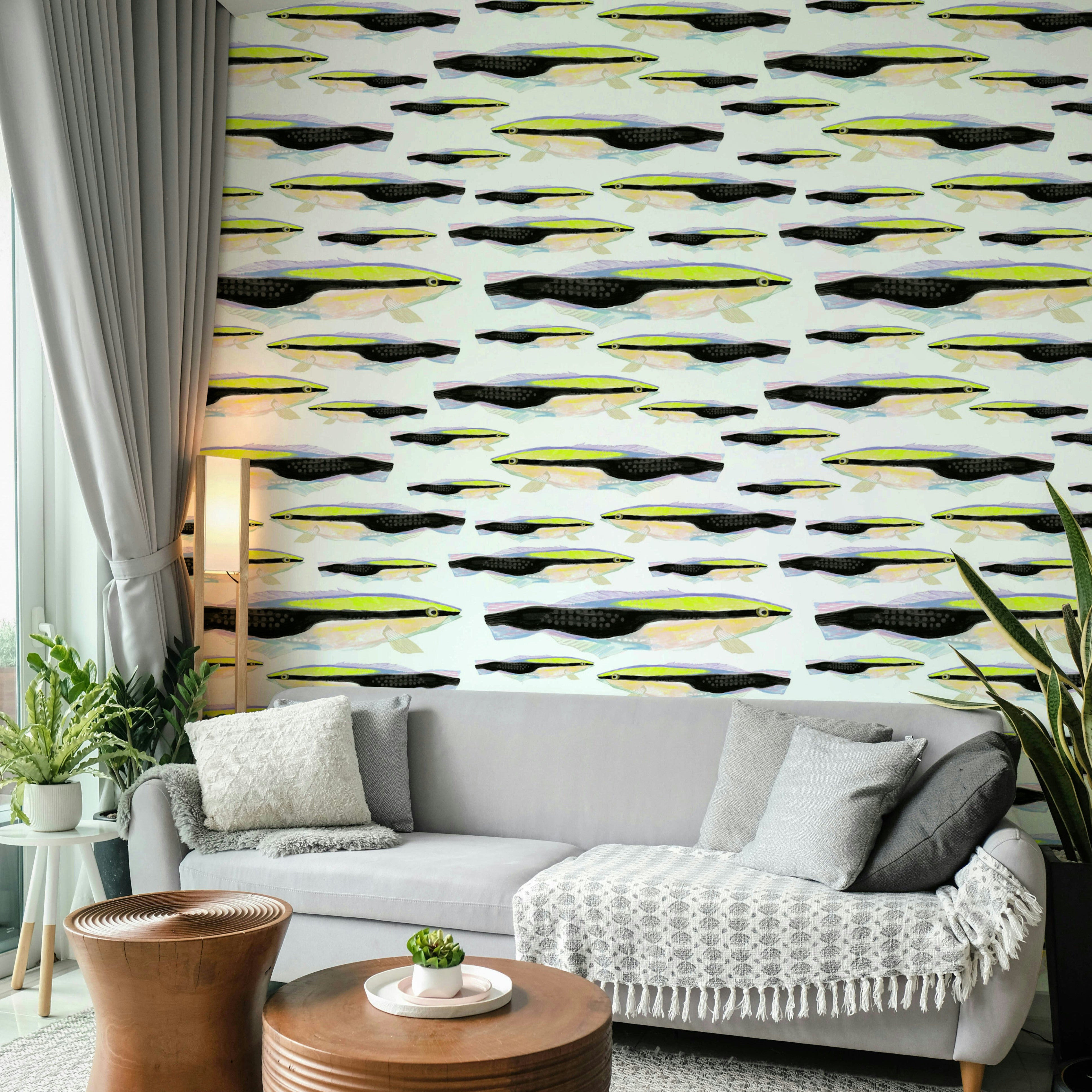 Dive into the vibrant underwater world with Animalia v2. This captivating wallpaper showcases a mesmerizing pattern of stylized fish, rendered in a playful watercolor style. Pastel hues of pink, lavender, and pale yellow contrast beautifully against bold black and bright chartreuse accents, creating a dreamy yet energetic aesthetic. Each fish features a unique, almost abstract interpretation of its form, emphasizing texture and color interplay over strict realism. Perfect for adding a touch of whimsical aquatic charm to any digital device, 'Animalia v2' is a tranquil yet stimulating visual experience.