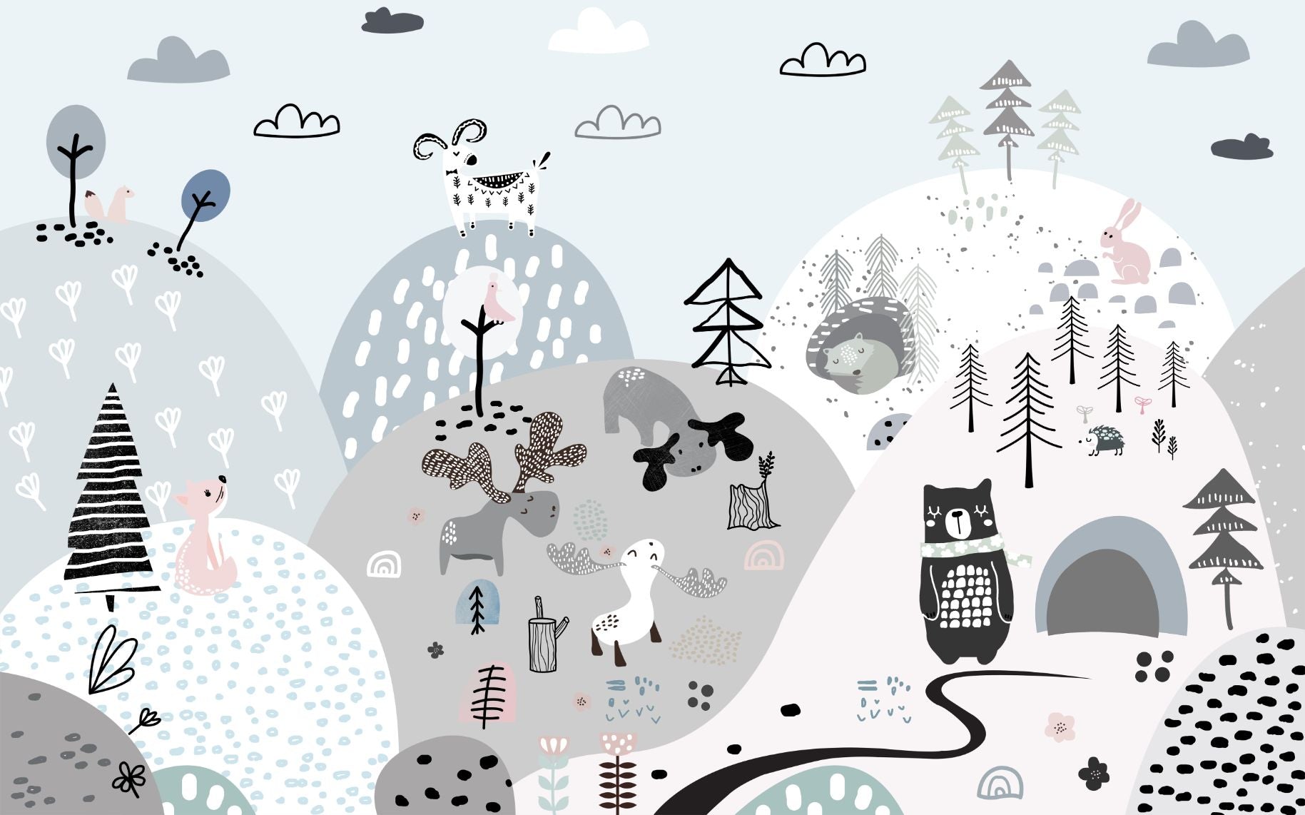 Playful woodland creatures on hills wallpaper mural.