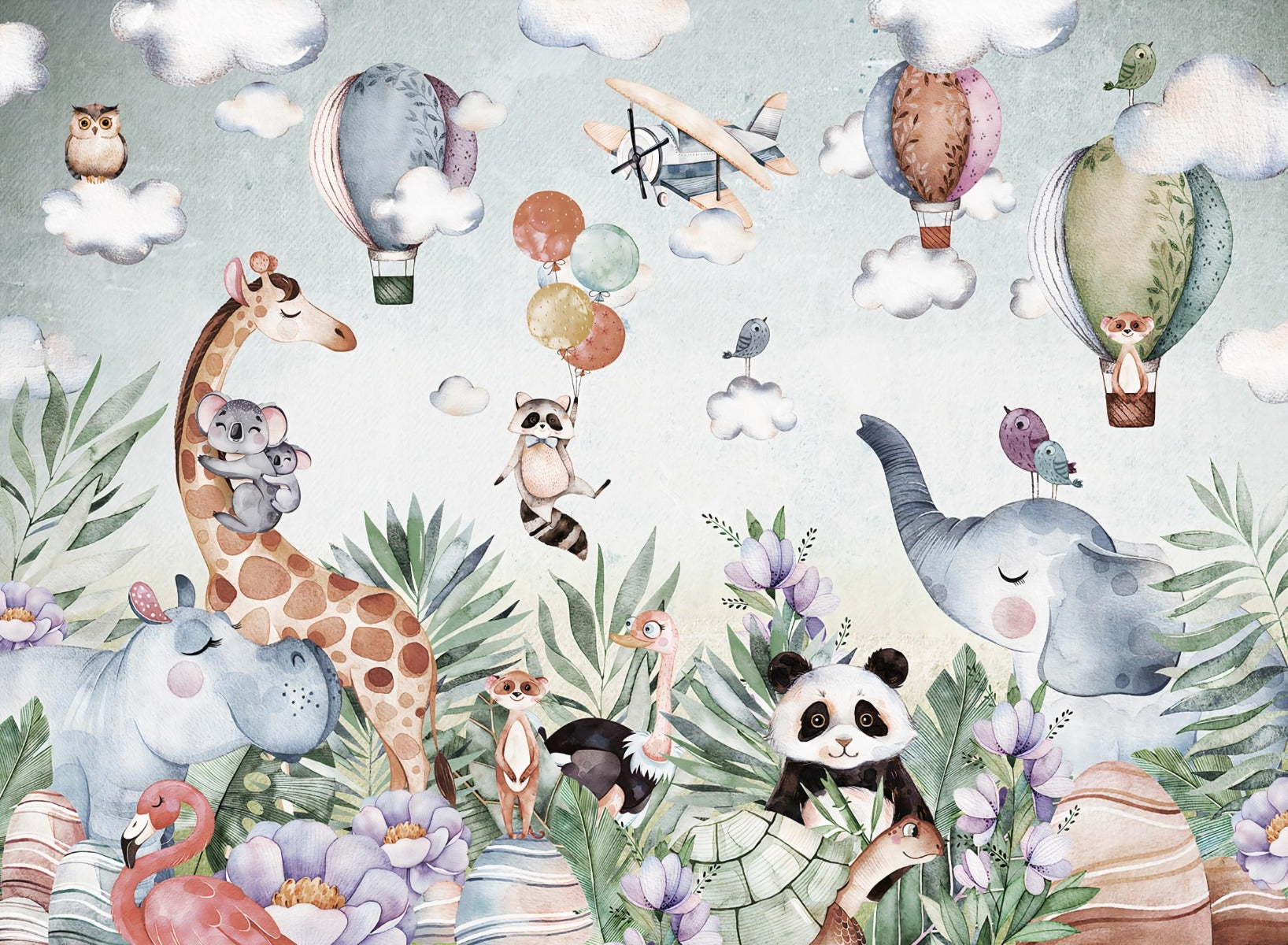 Bring your child's playroom to life with a vibrant and exciting cartoon jungle safari wallpaper. Every inch of the walls will feature exotic animals and lush vegetation, creating a dreamscape that ignites the imagination. The colors are bold and bright, perfect for sparking creativity and inspiring adventure. Your child will feel part of the jungle, immersed in a playful adventure with discoveries at every turn. This jungle safari mural wallpaper is not just a decoration but a piece of artwork that will transport your child to an exotic and lively new dimension.