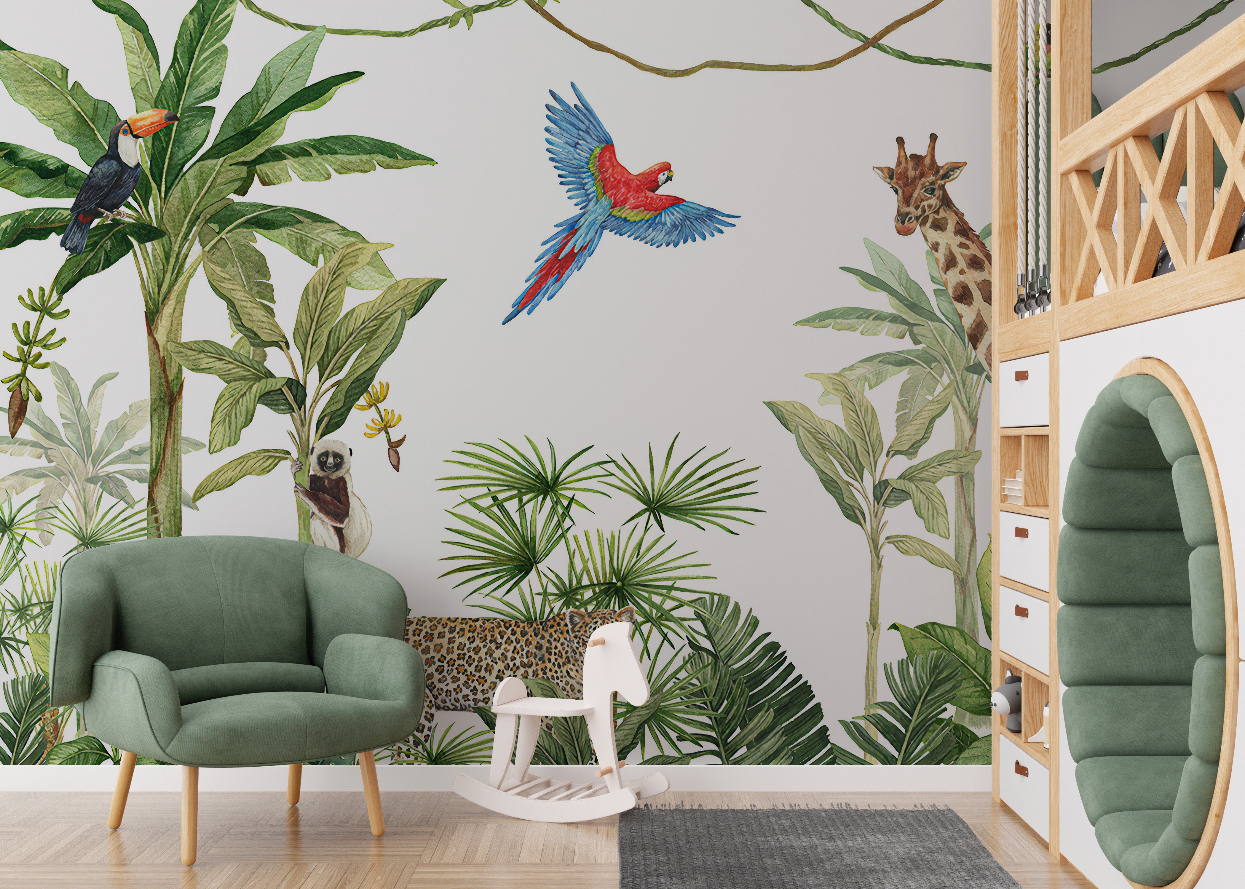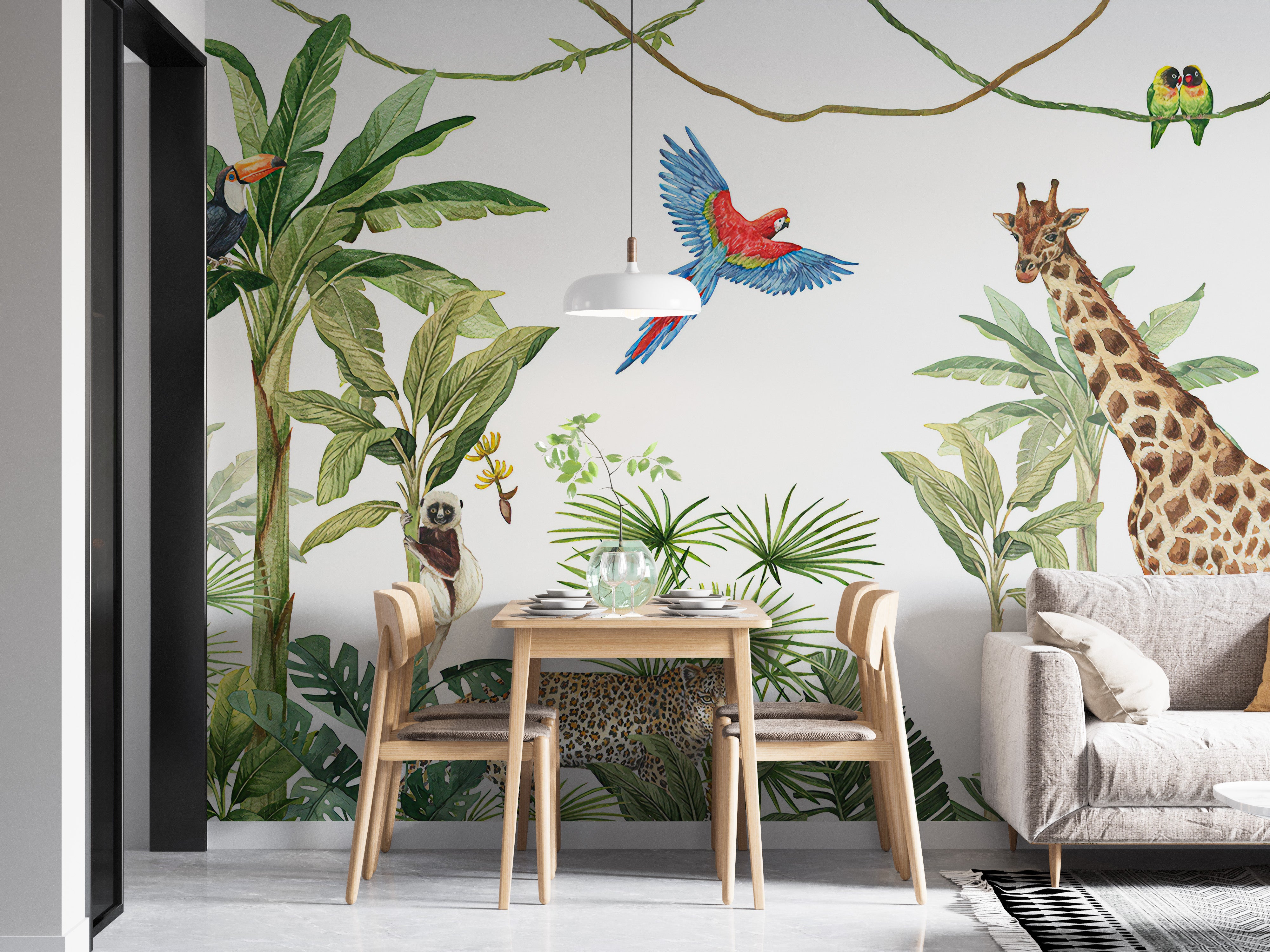 Bring the exotic beauty of the jungle to your home with wild jungle wonders peel and stick mural wallpaper. Adorn your walls with the magnificent creatures of the wild, like majestic giraffes and colorful tropical birds. The vibrant hues of the wallpaper for walls will add a touch of magic and whimsy to any room in your house, from bedrooms to living rooms. The peel and stick feature ensures hassle-free installation and removal, making it perfect for those who like changing their decor frequently. Elevate your space with this visually stunning and captivating wallpaper.