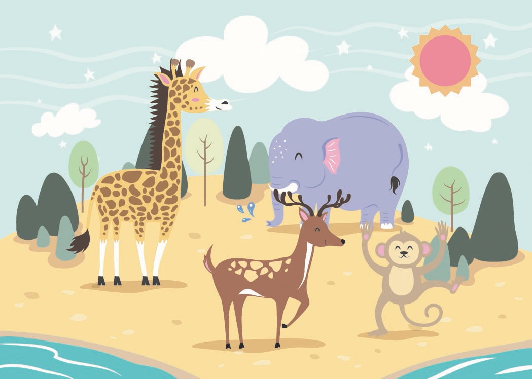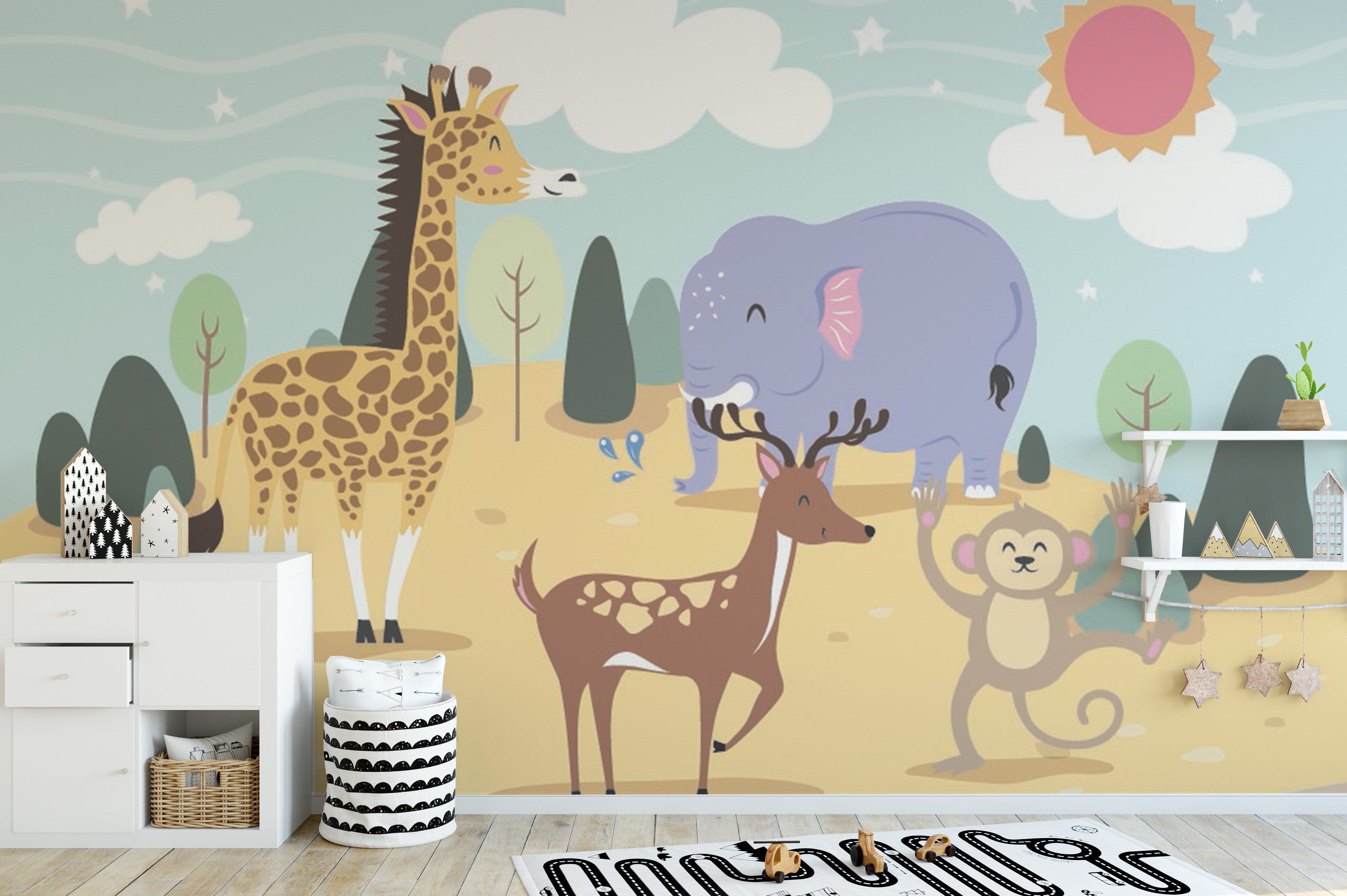 Create a captivating mural wallpaper ideal for a playroom, featuring cartoon animals joyfully playing on a picturesque island. This vibrant design showcases an array of friendly animals, including mischievous monkeys, gentle giraffes, and colourful birds, all engaging in playful activities against lush greenery and a sparkling blue sea. The lively scene, full of whimsy and fun, stimulates a child's imagination and adds a festive touch to any play area. The high-quality wallpaper is designed to be durable and easy to clean, making it suitable for the energetic environment of a playroom. With its rich, vivid colours and charming animal characters, this play area wallpaper is a delightful addition that will bring fun and adventure to any child's play space. Ideal for creating an engaging and joyful atmosphere, this mural is a wonderful way to enhance a room dedicated to play and creativity.