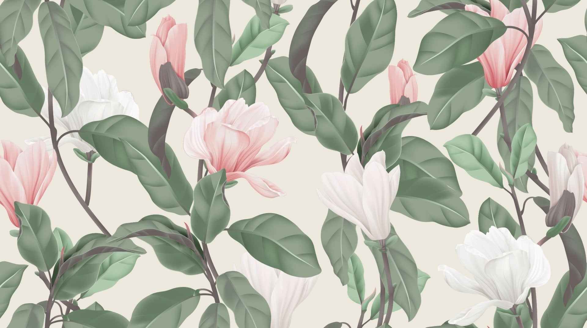 Immerse yourself in the beauty of our white and pink magnolia flower wallpaper murals. Drawing inspiration from the serene landscapes of Japan, these murals showcase the exquisite anise magnolia. Celebrate feminine grace and delicacy with this captivating design, featuring a medley of magnolia flowers in watercolor hues of pink and white. The mural is peppered with lush, evergreen leaf motifs, adding depth and vibrancy to the floral arrangement.