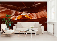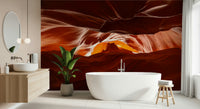 Bring the majesty of the Antelope Canyon to your home with this stunning image. Waves of sandstone curve and flow, painted in hues of deep red and golden light. The texture provides depth, making rooms feel larger and more dynamic. This wallpaper for walls is suitable for hallways, dining rooms or even a bathroom, and is versatile enough to suit modern, industrial or minimalist interiors.