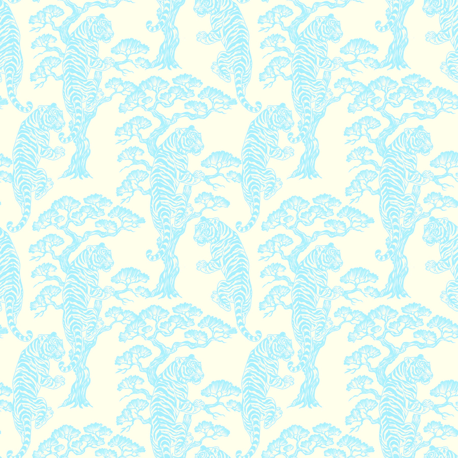 Transform your space with this elegant pattern. The wallpaper shows striking tigers among stylized trees, printed in light blue on a neutral background. This delightful wallpaper for walls brings a tranquil, exotic feel to any room. Perfect for a living room, bedroom, or hallway, the subtle palette adds a touch of sophistication. It is great for Scandi style interiors or japandi-inspired rooms, creating a calm and inviting atmosphere.