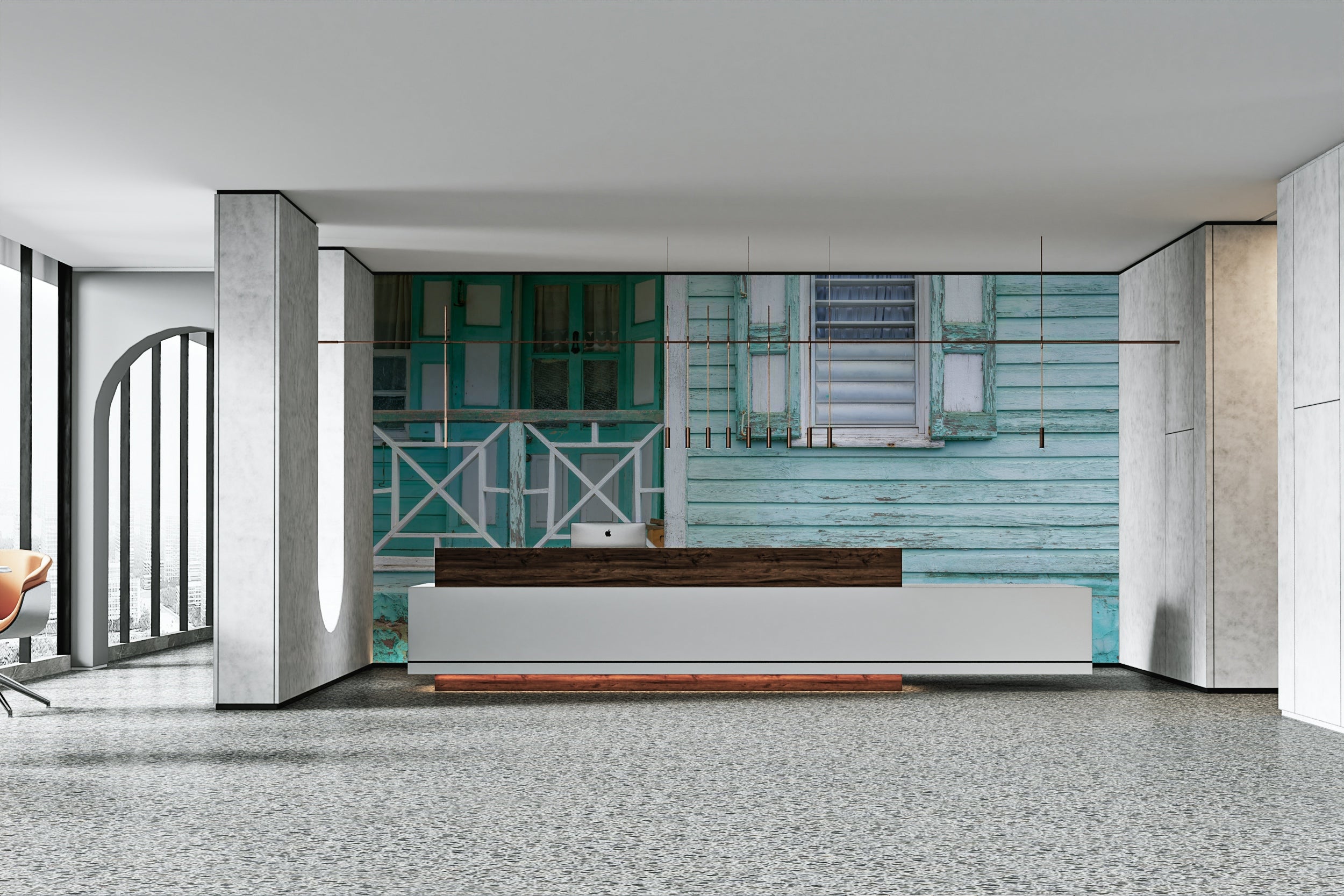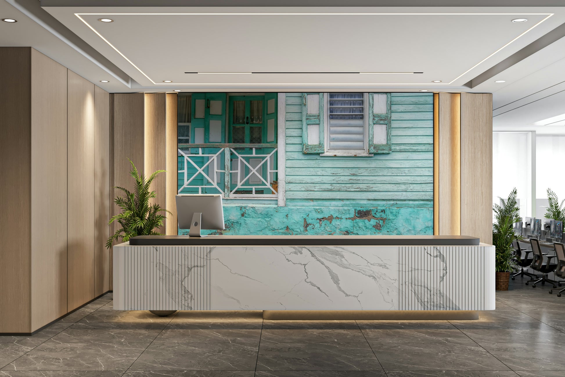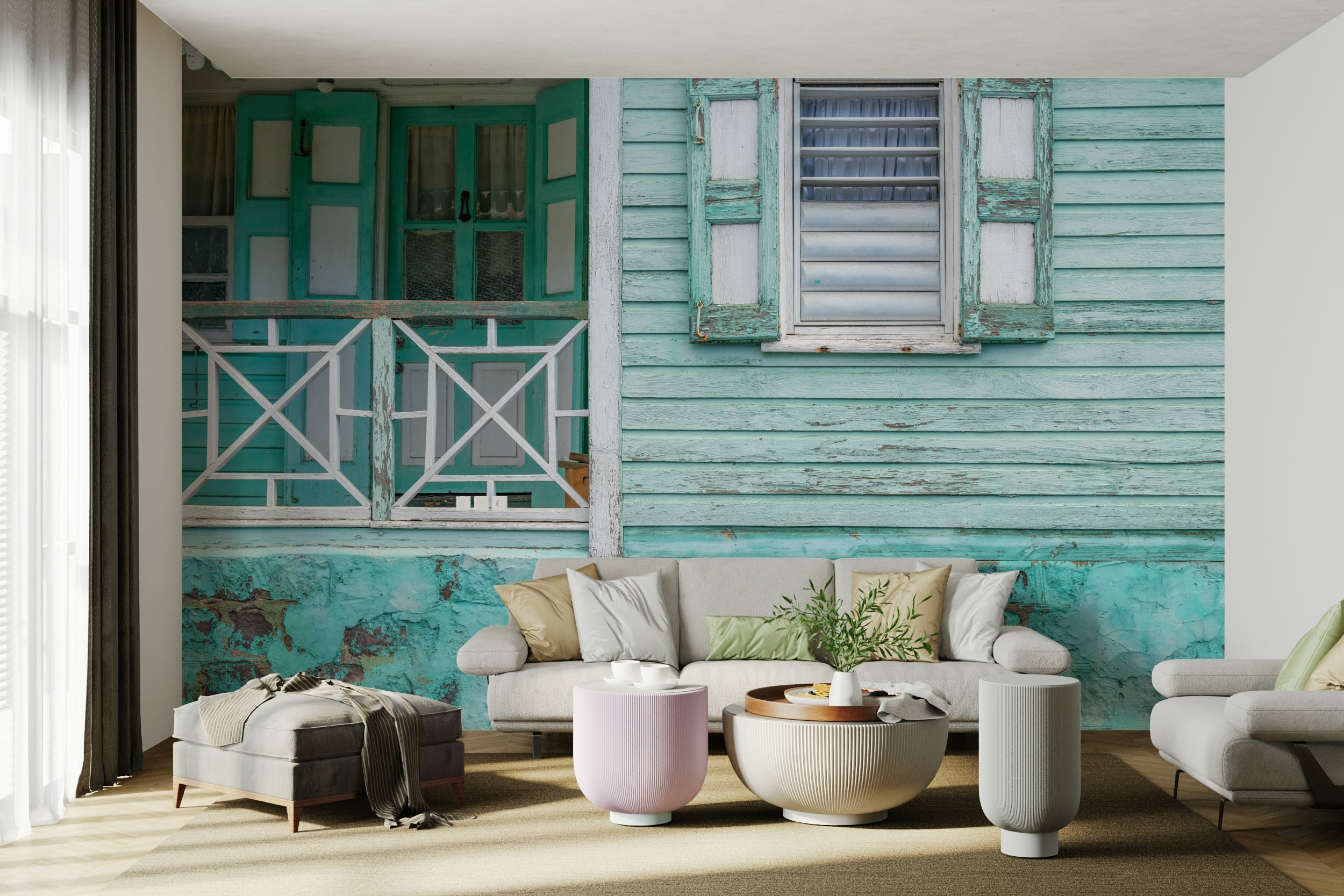 Turquoise wall mural with aged coastal house details.