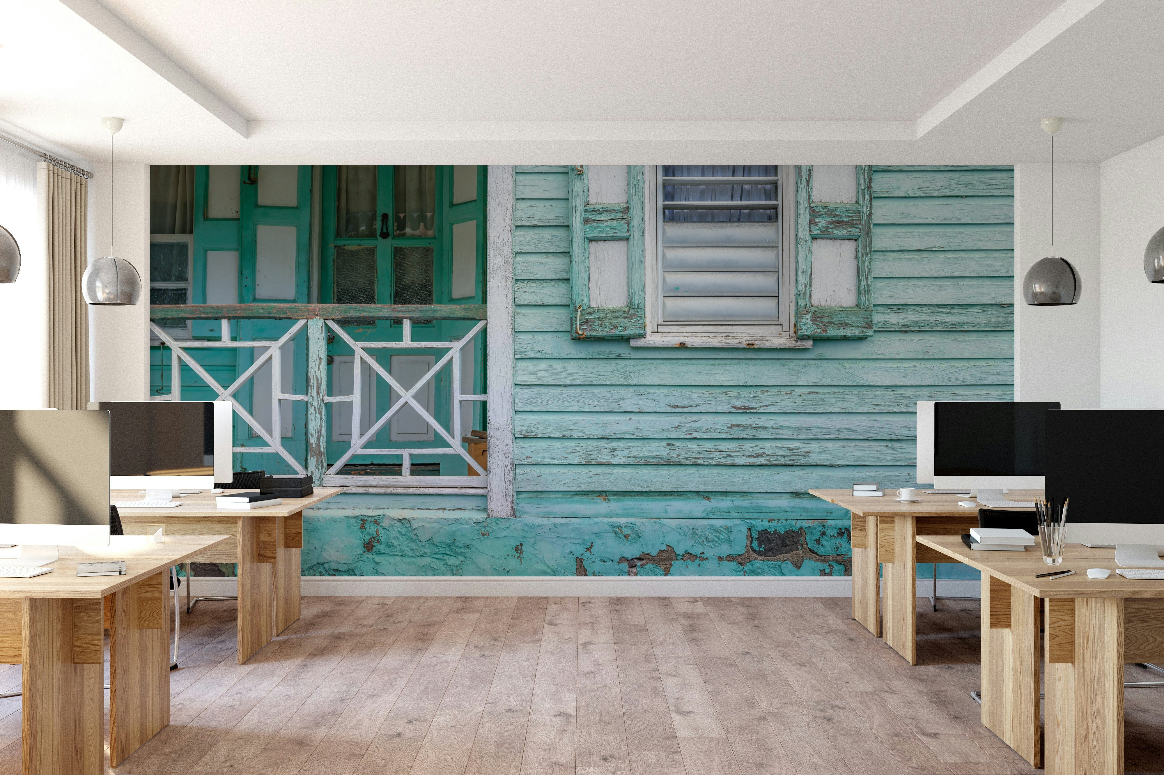 The Aqua Vintage Facade Wall Mural features the charm of an aged Caribbean-style wooden house in soft turquoise tones. With peeling paint, louvered shutters, and sun-washed textures, this mural wallpaper brings personality and character to any room. Ideal for accent walls in studios, lounges, or creative spaces, it offers a relaxed, lived-in vibe with a touch of nostalgia. Whether you're going for coastal cool or vintage flair, this wall mural sets the mood with effortless charm.
