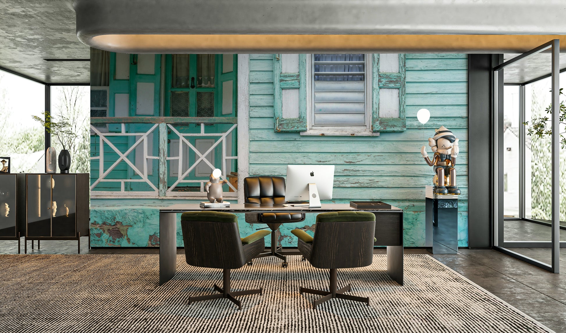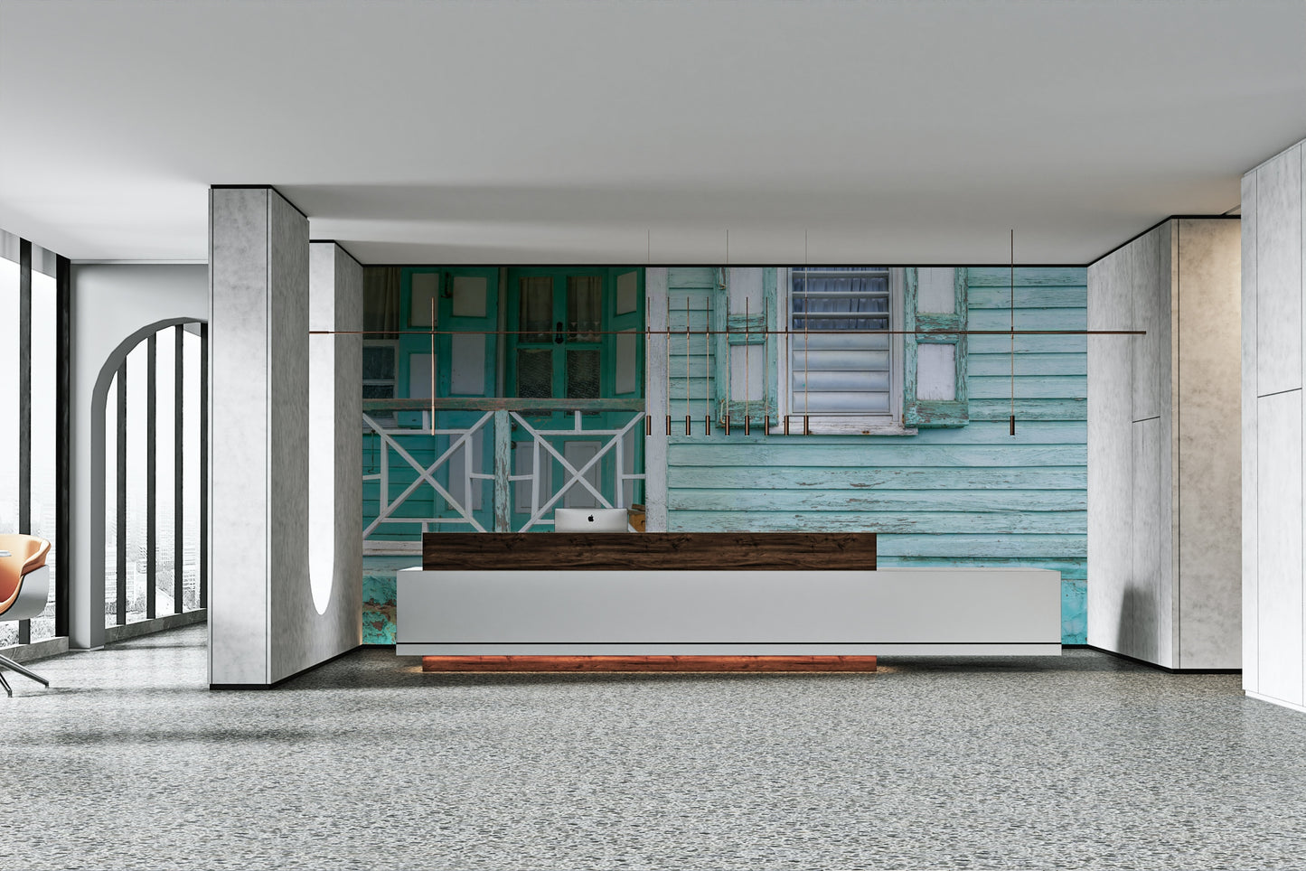 Aqua and white house facade wall mural.
