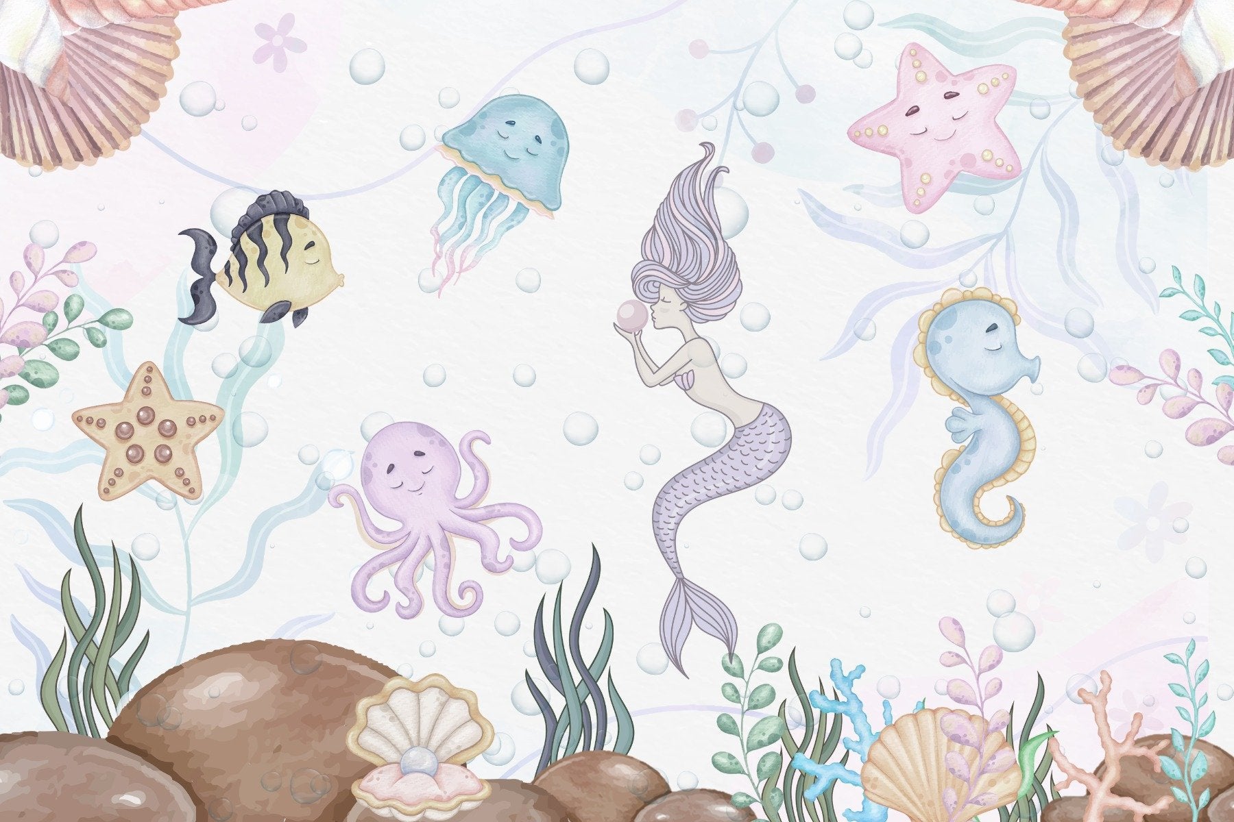 Immerse yourself in the underwater enchantment of the aquatic playland wall mural, a vibrant celebration of ocean life perfect for sparking imagination in any playroom or nursery. This captivating ocean wallpaper is a splash of joy, featuring smiling sea creatures and gentle mermaids that frolic amongst coral and pearls. It's a visual storybook on your wall, inviting young minds to explore the depths of the sea from the comfort of their play area. The playful palette and friendly marine characters make it an ideal choice for nursery wallpaper, turning bedtime stories into deep-sea adventures. Let the aquatic playland wall mural be the backdrop for countless hours of storytelling and creative play, where every glance is a dive into a world of wonder.