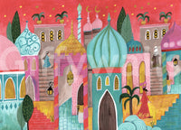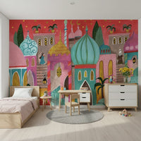 This delightful design showcases a whimsical rendition of a vibrant Middle Eastern city. The architecture, depicted in shades of pink, turquoise, and gold, brings a playful charm to any space. Use this wallpaper for walls to infuse warmth and character into nurseries, kids' rooms, or even a cosy living room. The soft, hand-drawn style adds a touch of innocence and imagination, crafting a happy and inviting environment. It blends easily with modern and traditional furnishings alike.