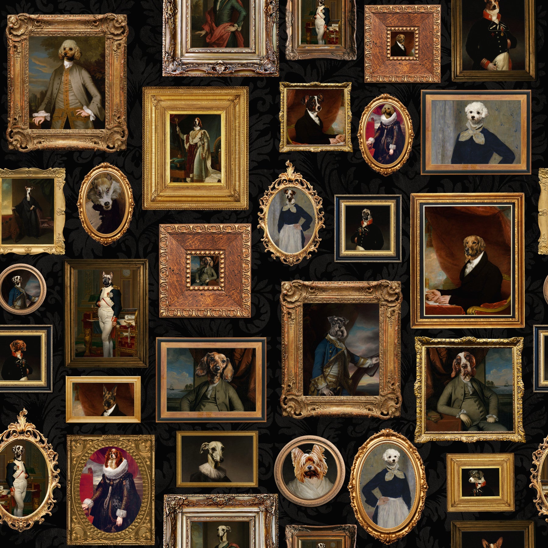 Transform your room with this engaging wallpaper by Uta Naumann for walls featuring dignified dogs. Adorned in regal garb and surrounded by ornate golden frames, these canine portraits bring a touch of playful elegance to any space. The detailed portraits pop against the dark background, offering a look into a world where dogs ruled. Decorate a dining room, hallway, or study with this pattern that complements interiors with an artistic flair. Its unique charm and humour will surely delight.