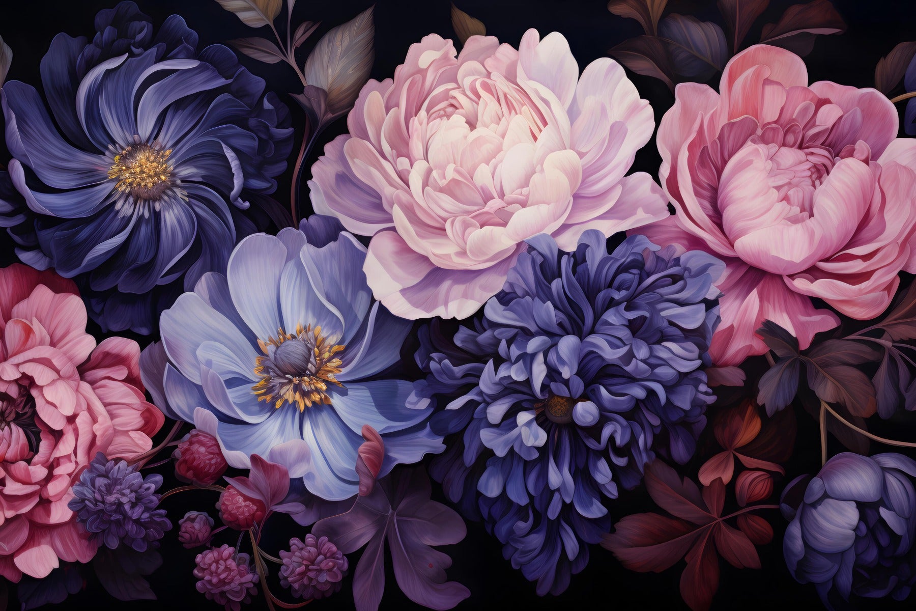 Discover the allure of the Aromatic Bouquet Wallpaper Mural, a vibrant symphony of floral artistry destined to become the heart of any room. This exquisite flower wallpaper encapsulates the essence of a secret garden at dusk, with lush petals that seem to dance in the still air. Deep blues and soft pinks tell tales of mysterious beauty, captivating the viewer with their delicate interplay. This mural is a testament to nature's raw poetry, designed to fuse with your unique style. It offers an escape into a world where every wall is a blossoming canvas, inviting you to bask in the perpetual bloom of an eternal spring. Envelope yourself in the aroma of artistic splendour with this botanical masterpiece.