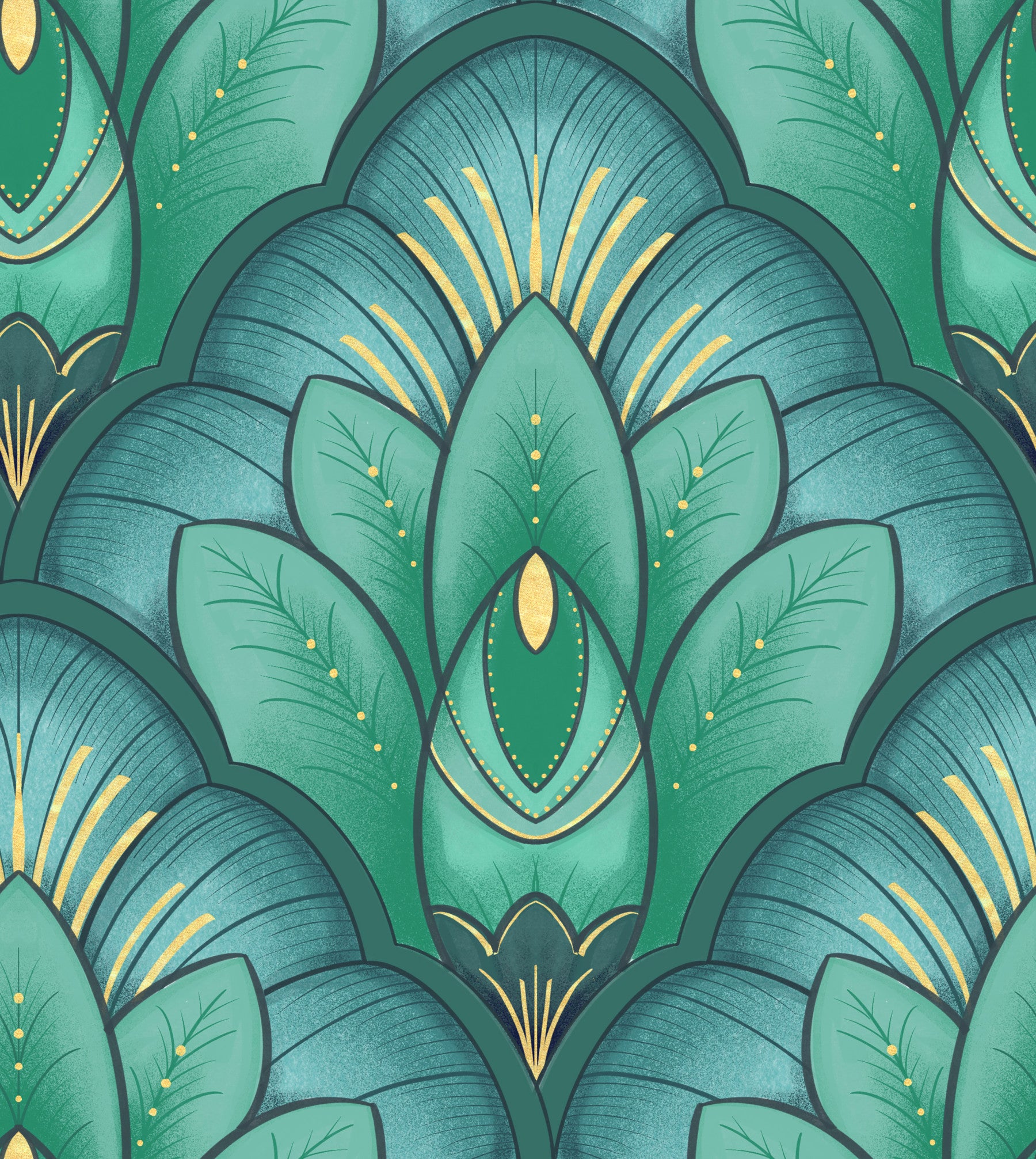 Immerse yourself in the luxurious elegance of the 'Art Deco Emerald Lotus' wallpaper. This design embodies the opulence of the Art Deco era, seamlessly blended with the serene beauty of the lotus flower. The color palette features rich emerald and teal hues, accented with shimmering gold details that catch the light, creating a sense of depth and sophistication. The stylized lotus petals are arranged in a repeating pattern, evocative of classic Art Deco motifs and creating a soothing, symmetrical harmony.