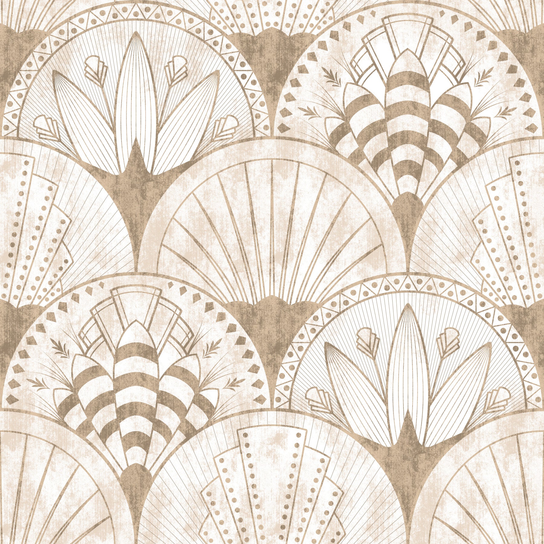 This wallpaper design captures the timeless sophistication of Art Deco style. The intricate geometric patterns, reminiscent of stylized fans and floral motifs, are rendered in elegant beige and off-white hues. A subtle textured background adds depth and visual interest, creating a feeling of luxurious vintage charm. Perfect for adding a touch of classic glamour to any space, from living rooms and dining rooms to bedrooms and hallways. The muted color palette ensures a calming yet stylish atmosphere, making it versatile enough to complement a variety of interior design styles.
