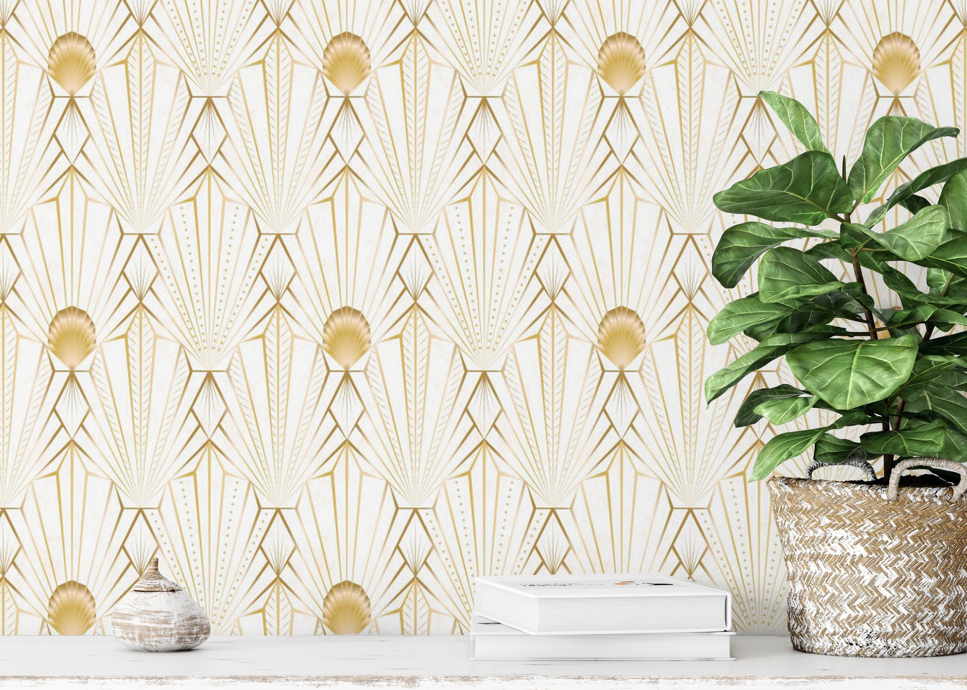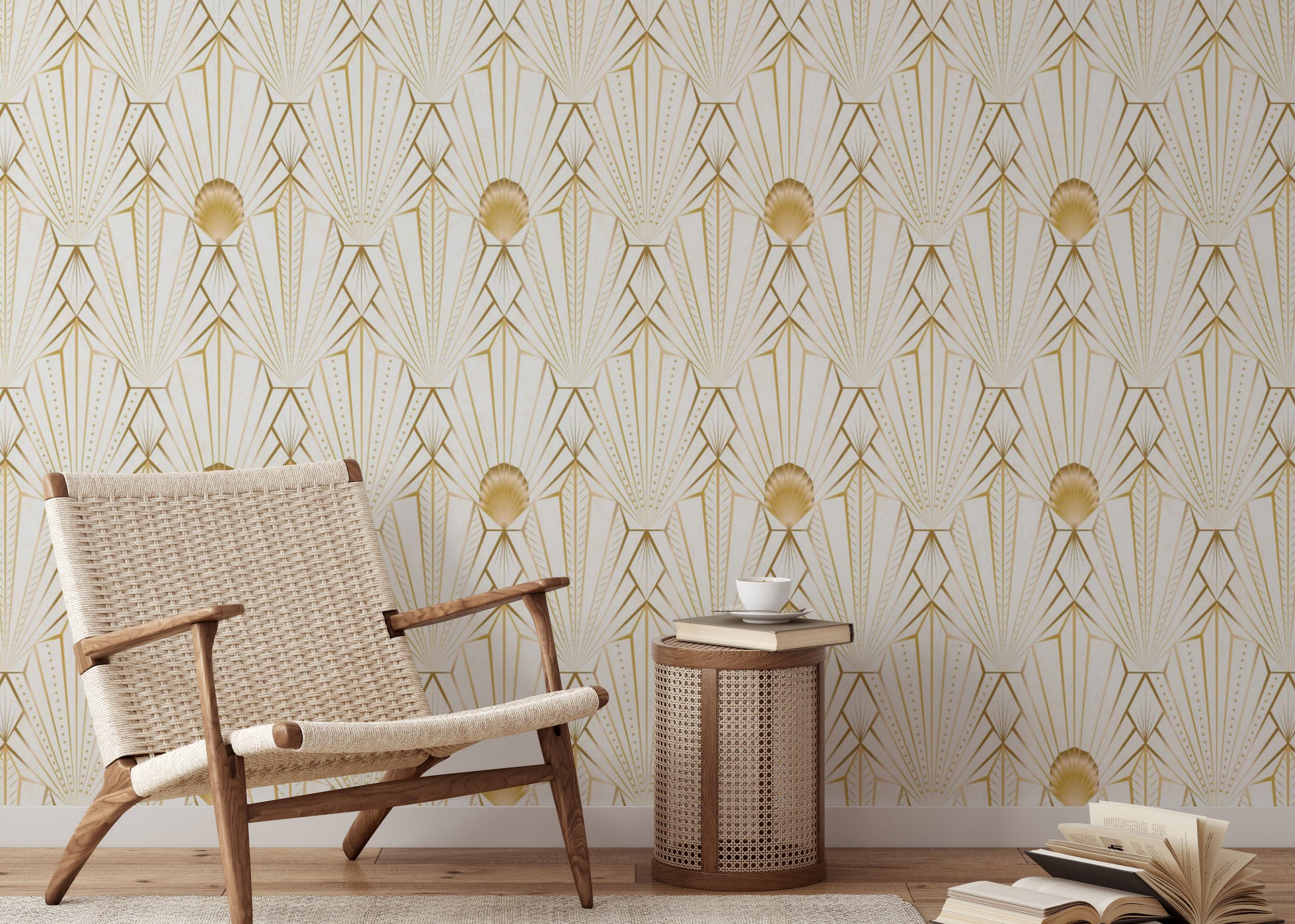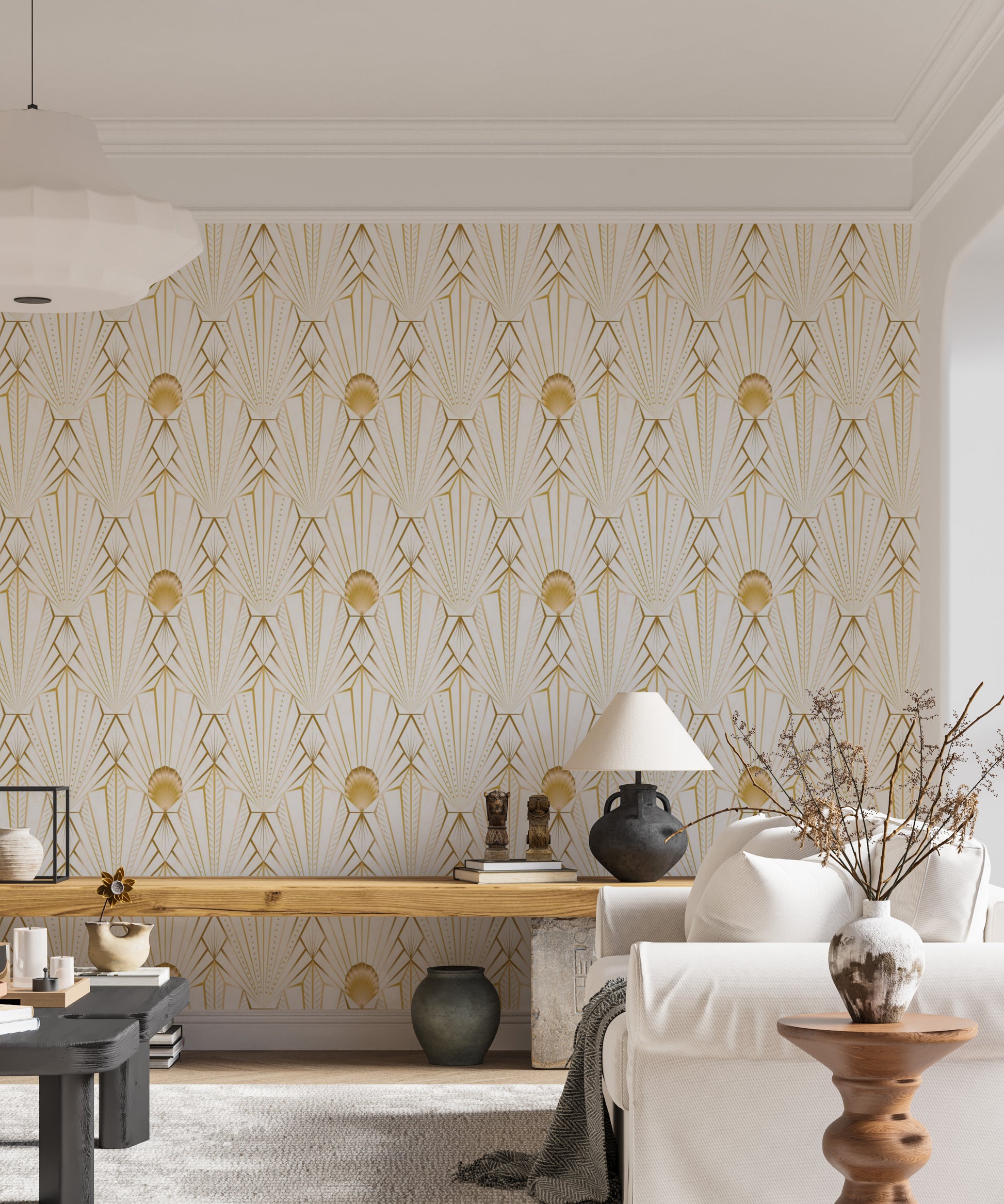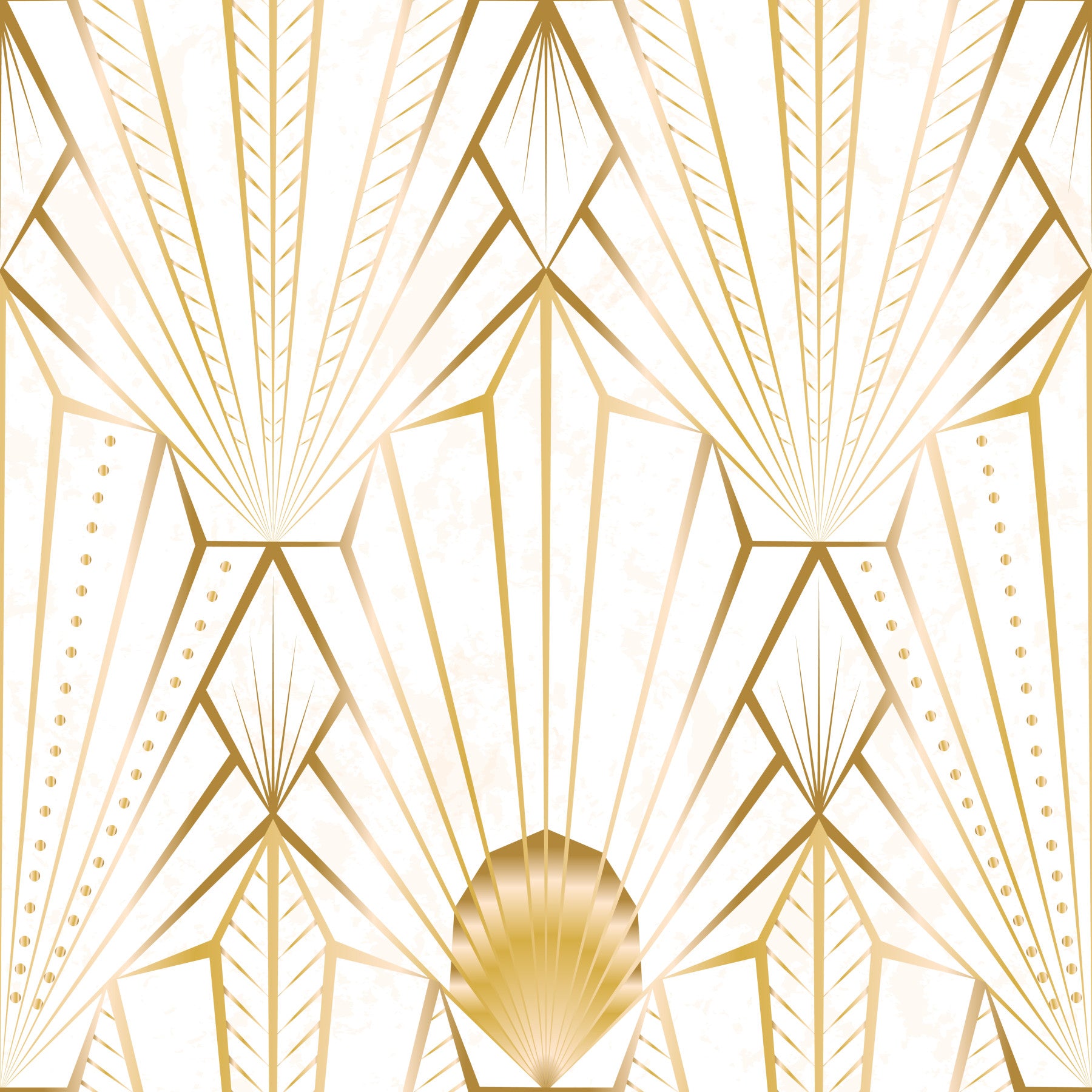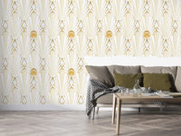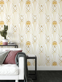 Indulge in the opulent charm of this Art Deco-inspired wallpaper. Gold geometric lines radiate outwards from a central sunburst motif, creating a captivating interplay of light and shadow against a creamy white backdrop. Subtle textured details enhance the luxurious feel, making it perfect for adding a touch of vintage glamour to any space. The seamless pattern ensures a cohesive and sophisticated look, suitable for living rooms, bedrooms, or even a statement feature wall in an office. This wallpaper's refined aesthetic is both timeless and trending, instantly elevating your décor with its graceful design and rich gold accents.