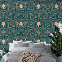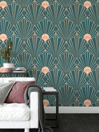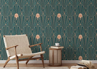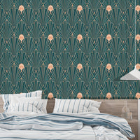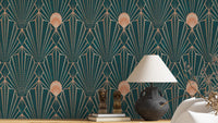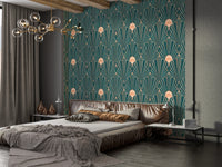 Infuse your space with a touch of modern luxury using this captivating geometric wallpaper. The rich teal backdrop provides a grounding contrast to the shimmering rose gold lines, forming a mesmerizing interplay of shapes and light. The intricate Art Deco-inspired pattern creates a sense of movement and depth, adding a sophisticated touch to any room. This wallpaper seamlessly blends vintage aesthetics with contemporary design principles, perfect for those seeking a unique and visually stunning addition to their home decor. The repeating pattern makes this piece perfect for covering large areas without sacrificing impact.
