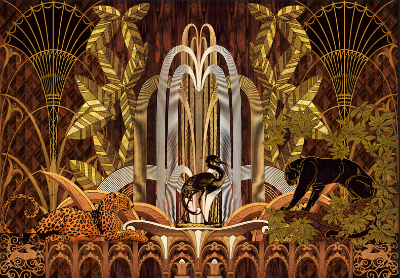 Tropical-inspired Art Deco wall mural featuring wildlife and golden details