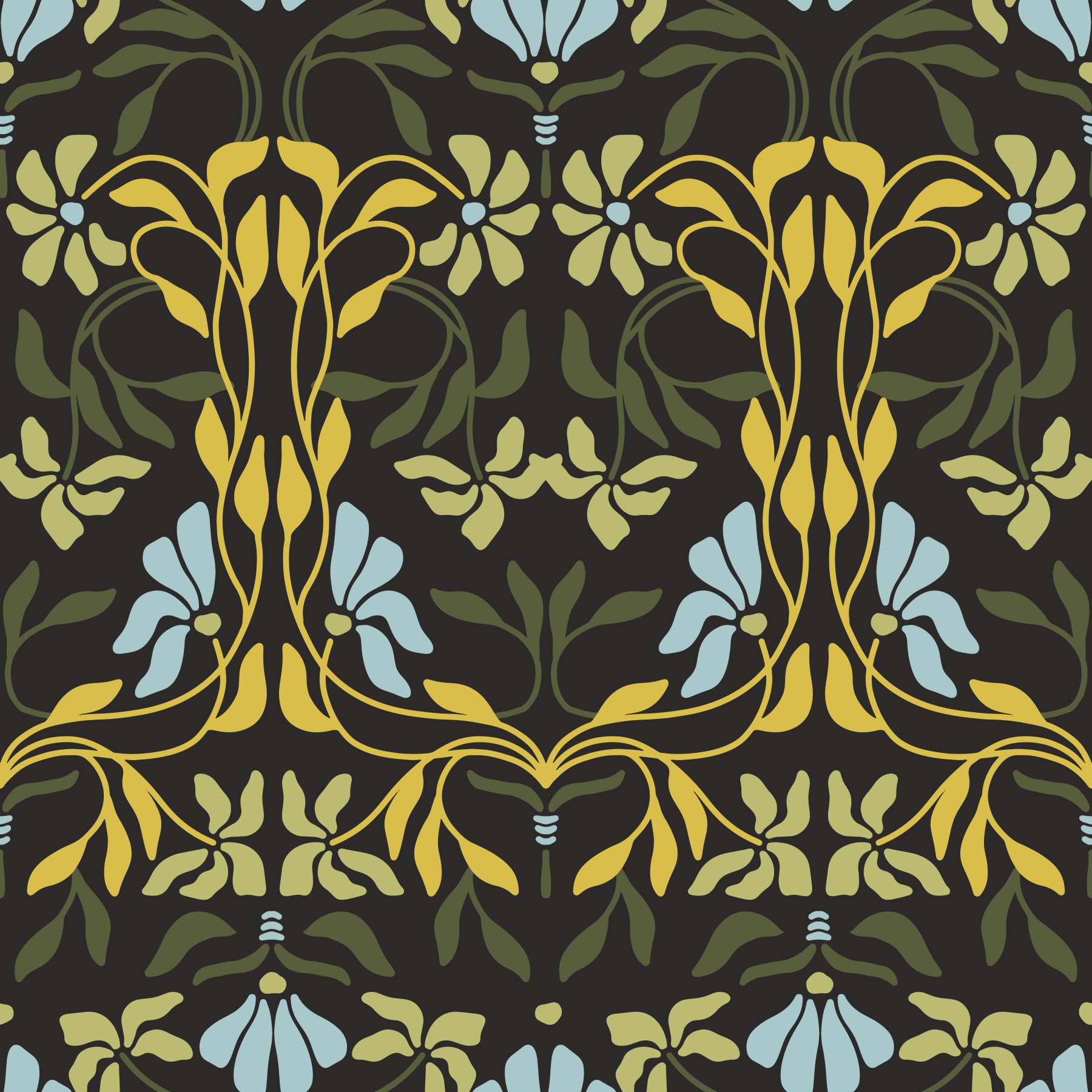 Embrace the beauty of a nocturnal garden with this wallpaper. The design presents a mesmerizing tapestry of stylized flowers and leaves rendered in muted yet rich tones of yellow, olive, and pale blue, set against a sophisticated dark charcoal backdrop. The repeating pattern subtly hints at an Art Deco influence, bringing both elegance and a touch of vintage flair to your interiors. Its rich color palette evokes a tranquil and sophisticated mood, perfect for adding a touch of understated luxury to bedrooms, living rooms, or hallways. The intricate detail creates a calming atmosphere, making it a stylish and refined choice for your home.