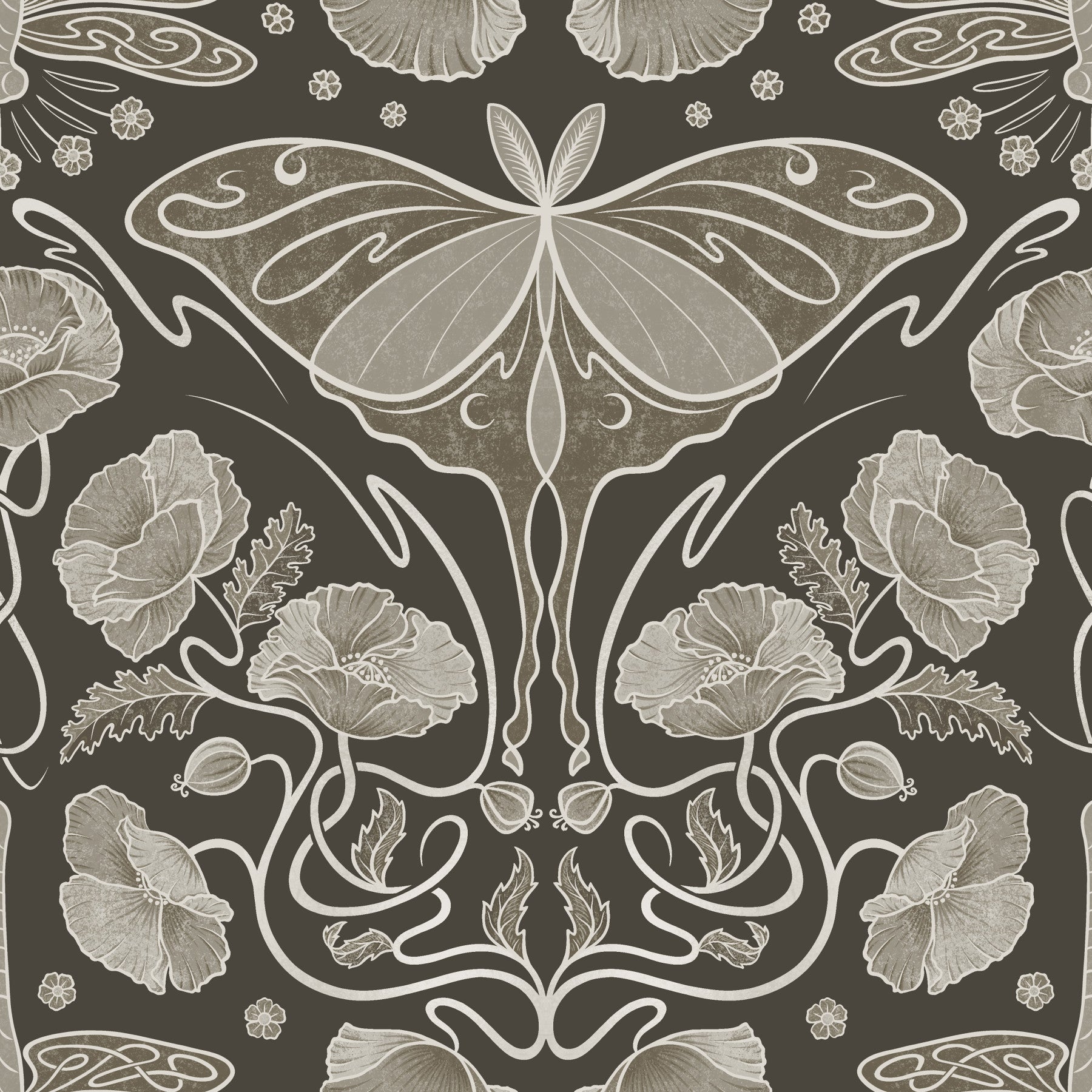 This wallpaper design evokes a serene and mystical atmosphere with its intricate Art Nouveau pattern. Delicate line art intertwines graceful poppies and majestic luna moths, creating a balanced and elegant composition. The muted taupe and dark brown color palette adds a touch of sophistication, perfect for a tranquil bedroom or a calming study. The textured appearance of the design adds depth and visual interest, giving it a handcrafted feel. This wallpaper is a perfect blend of nature-inspired motifs and artistic expression, bringing a touch of vintage charm to any space.