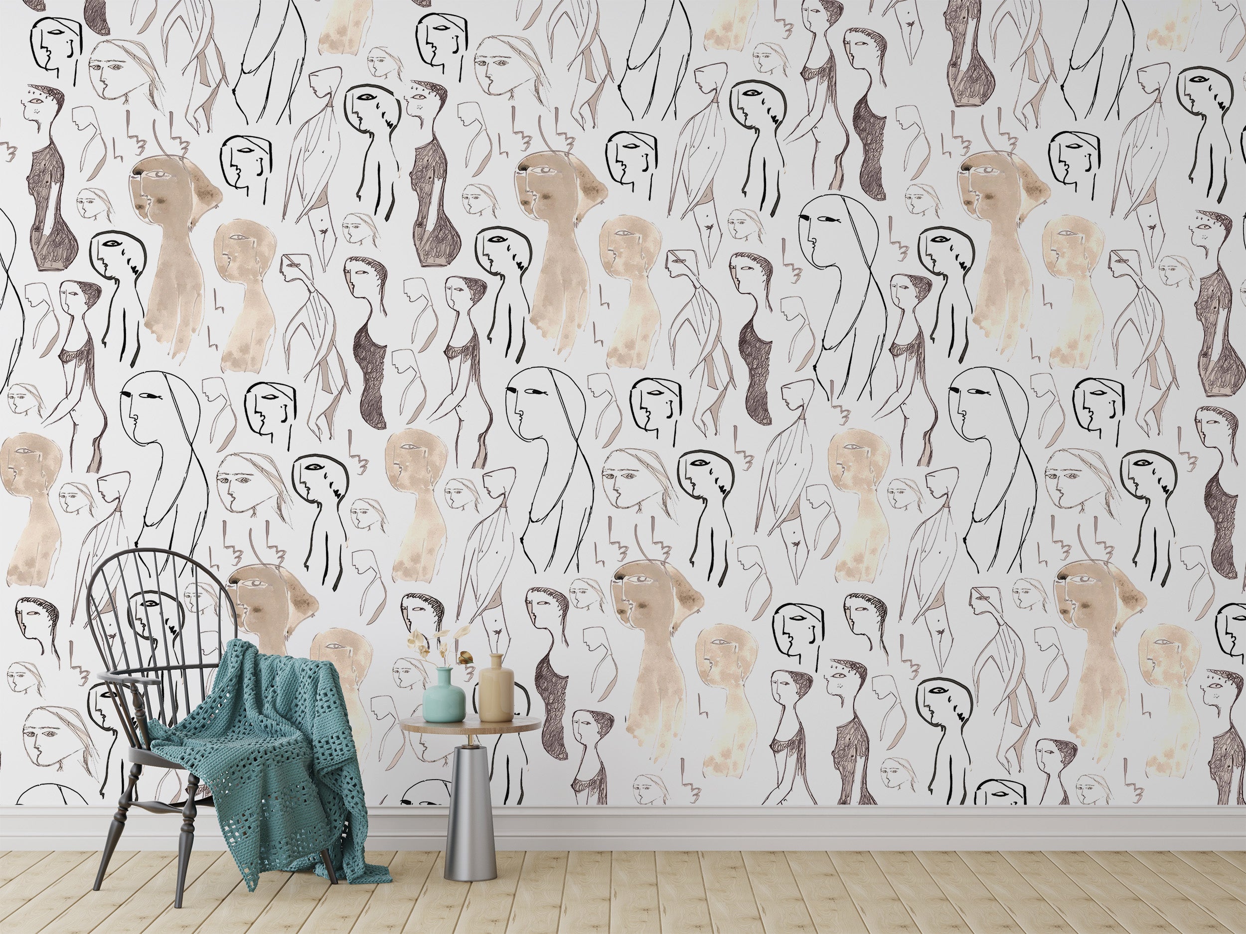 Enhance your interior with the artistic faces design wall mural. This captivating art wallpaper showcases a collection of abstract faces in earthy tones, blending contemporary art with modern aesthetics. Perfect for adding a unique touch to any room, this mural becomes an eye-catching centerpiece. Ideal for living rooms, bedrooms, or creative spaces, its intricate design and neutral palette harmonize with various styles. Embrace the artistic vibe and make a bold statement with this wall mural, where each face tells a story and adds character to your walls, transforming your space into a gallery of modern art.