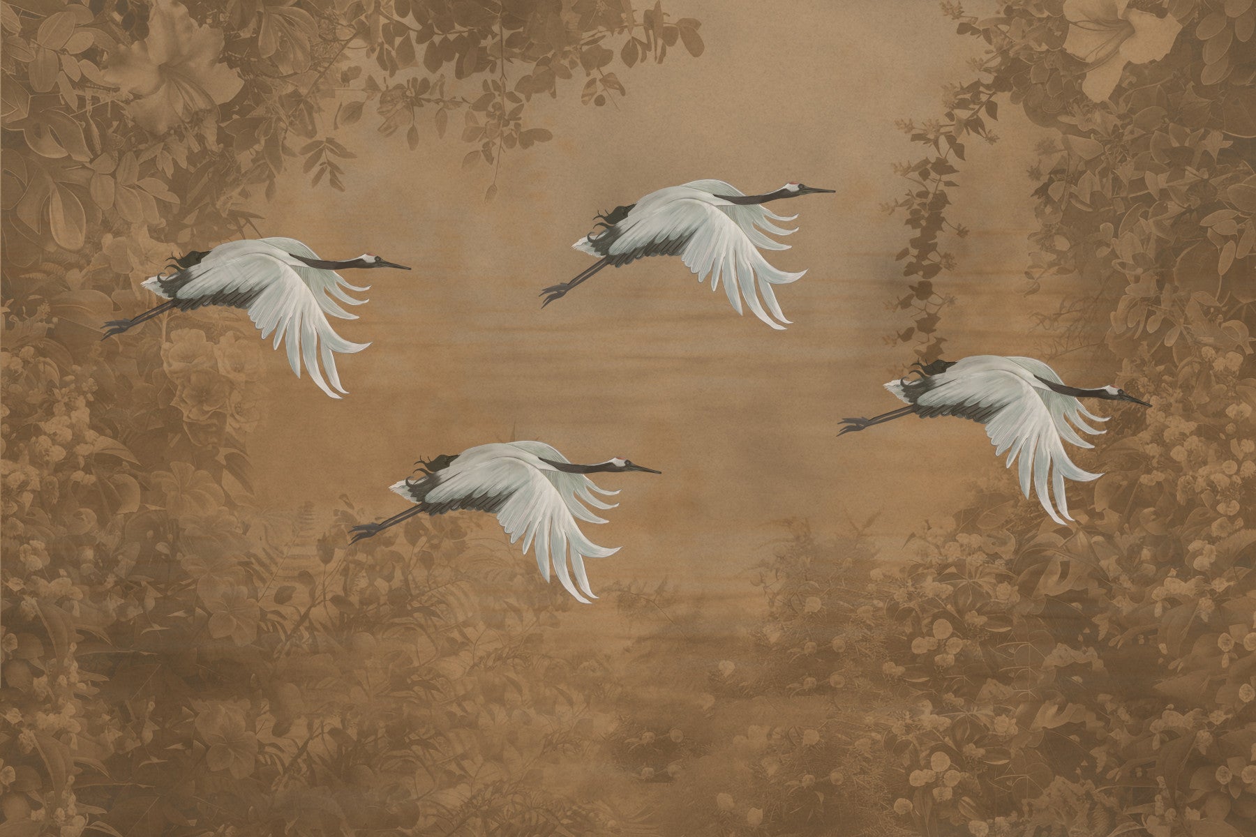 Bring a touch of Eastern serenity to your home with this beautiful wallpaper for walls. Observe the artwork showcasing cranes in flight among vintage floral designs. This sophisticated design enhances any bedroom, living room or dining room. The sepia tones evoke a sense of calm and understated elegance. It is a perfect addition to any space, making it the perfect piece for the decor of your dreams. This image will complete a boho decor style.