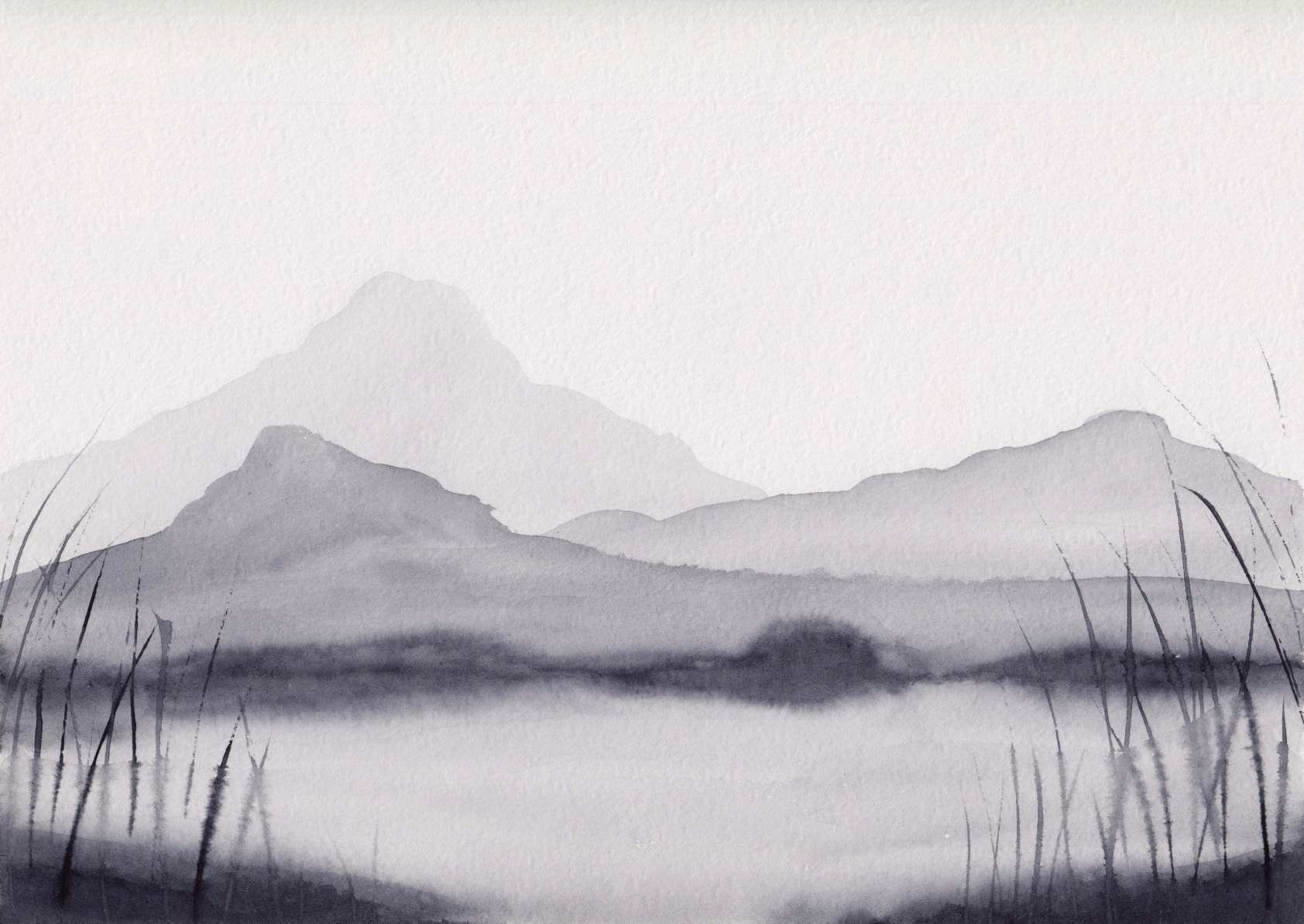 Monochrome mountain scene wallpaper with watercolor effect.