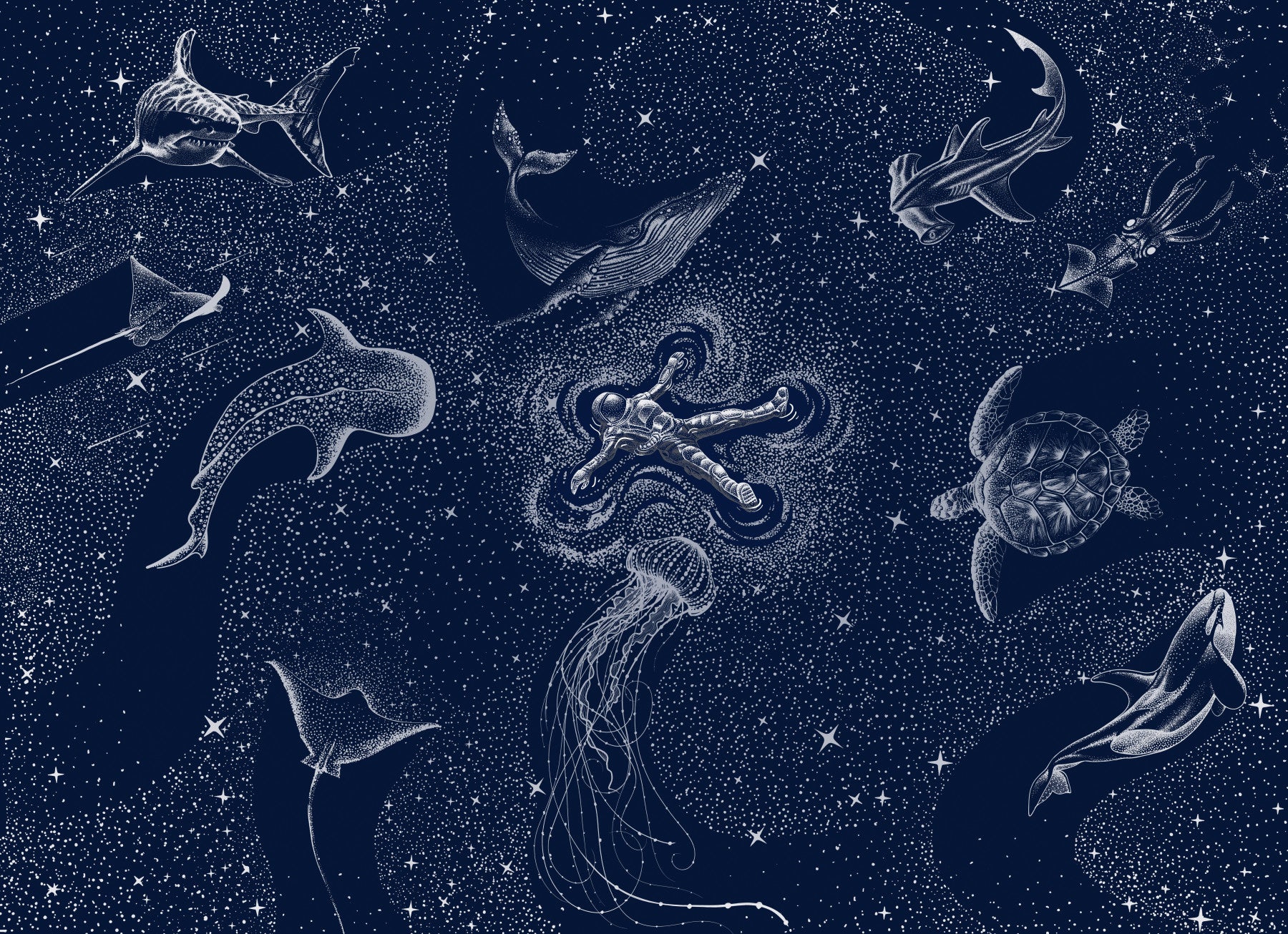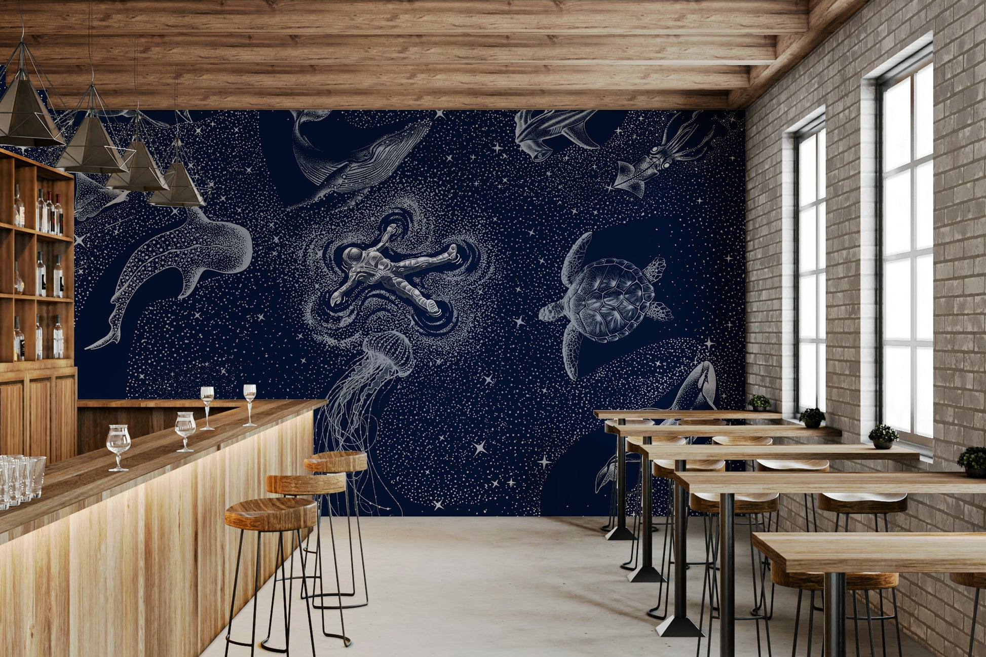 Journey to a celestial sea with this unique wallpaper. An astronaut adrift in a star-filled sky meets marine life. Sharks, whales, rays, a turtle, and jellyfish are woven amongst a blanket of stars in this mesmerising image. This unique wallpaper for walls makes a statement in any space. It can enhance a living room by adding an imaginative touch or give a bedroom a calming, otherworldly ambiance. The navy and white design creates a sophisticated look that works great with minimalist or nautical decor.