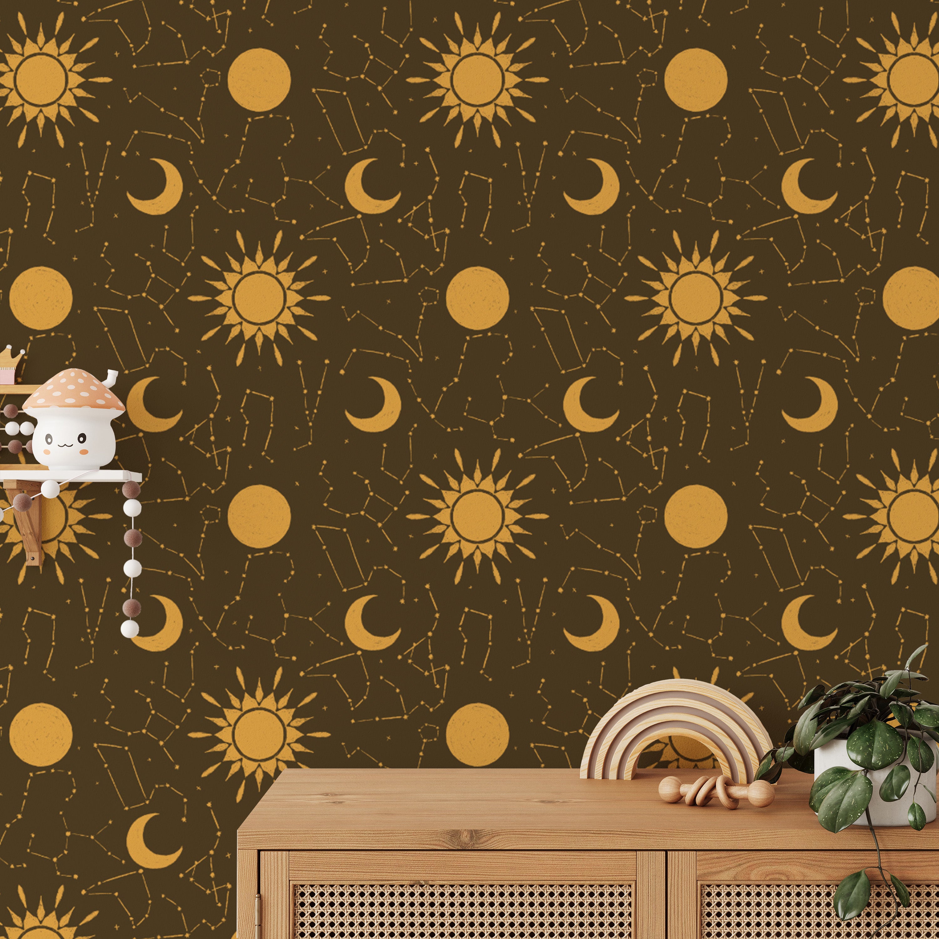 Let your child's room shine with the wonder of the cosmos through the astrology constellations design wallpaper as a kids space wallpaper. This wallpaper brings the night sky closer, featuring detailed constellations and celestial symbols like suns and moons, offering an educational and engaging backdrop for any child's room. The design captivates young imaginations, encouraging curiosity about the stars and the universe. Ideal for creating a space where learning meets play, this wallpaper is perfect for little astronomers. Invest in this captivating wallpaper today and watch your child’s love for the stars grow.