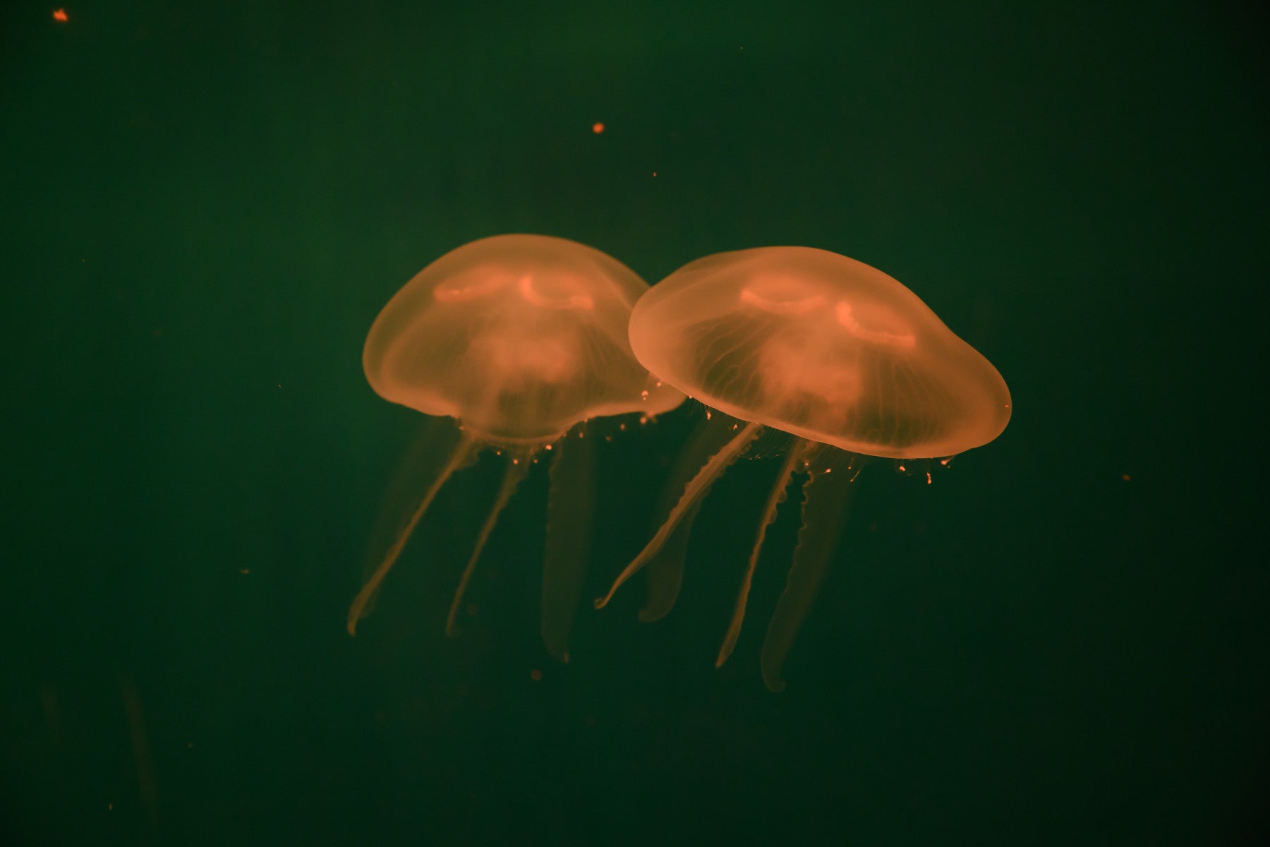 Immerse yourself in the tranquil depths with Ocean's Embrace a captivating wallpaper featuring two ethereal jellyfish gracefully dancing against an abyss of deep sea green. Bathed in a soft, golden light, these mesmerizing creatures seem to float effortlessly, their delicate tentacles trailing behind them like silken threads. The contrast between the luminous jellyfish and the shadowy background creates a serene and enchanting visual experience, perfect for adding a touch of underwater magic to your device. Let this image transport you to a world of silent beauty and calming movement, where the rhythm of the ocean whispers secrets of the deep.