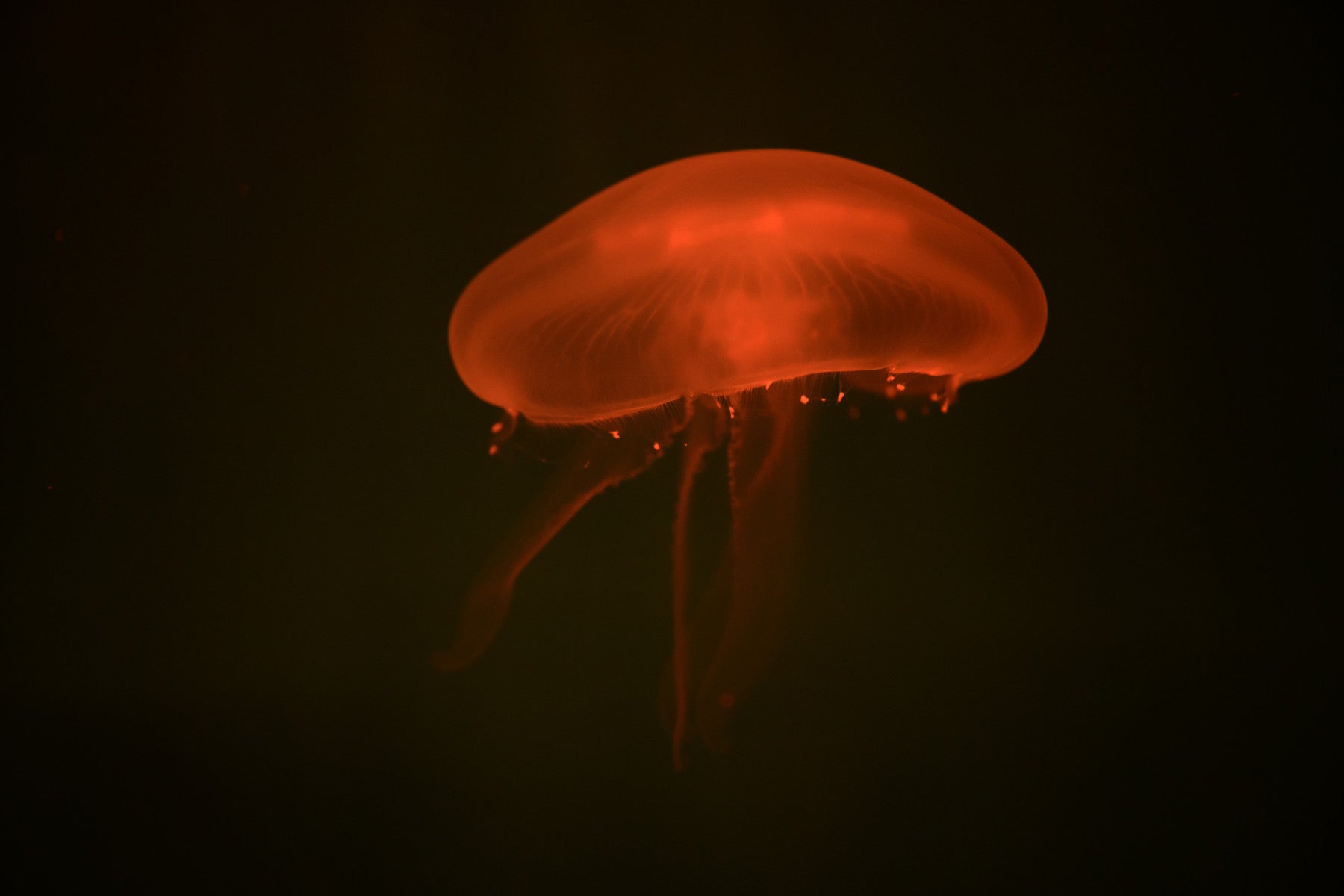 Immerse yourself in the captivating depths with At the Aquarium #8 a mesmerizing wallpaper that evokes the ethereal beauty of marine life. This stunning image features a luminous jellyfish gracefully drifting in the inky blackness of its underwater world. Bathed in a soft, otherworldly orange glow, the jellyfish's delicate form is accentuated, creating a mesmerizing contrast against the dark backdrop. Its translucent bell pulsates with an inner light, while its trailing tentacles weave a mesmerizing dance, captivating viewers with their slow, hypnotic movements. This wallpaper offers a glimpse into a serene and mysterious realm, bringing the calming tranquility of the deep sea to your screen. Perfect for those seeking a touch of magic and tranquility in their digital space, "At the Aquarium #8" is a captivating visual experience that will transform your device into a portal to the ocean's hidden wonders.