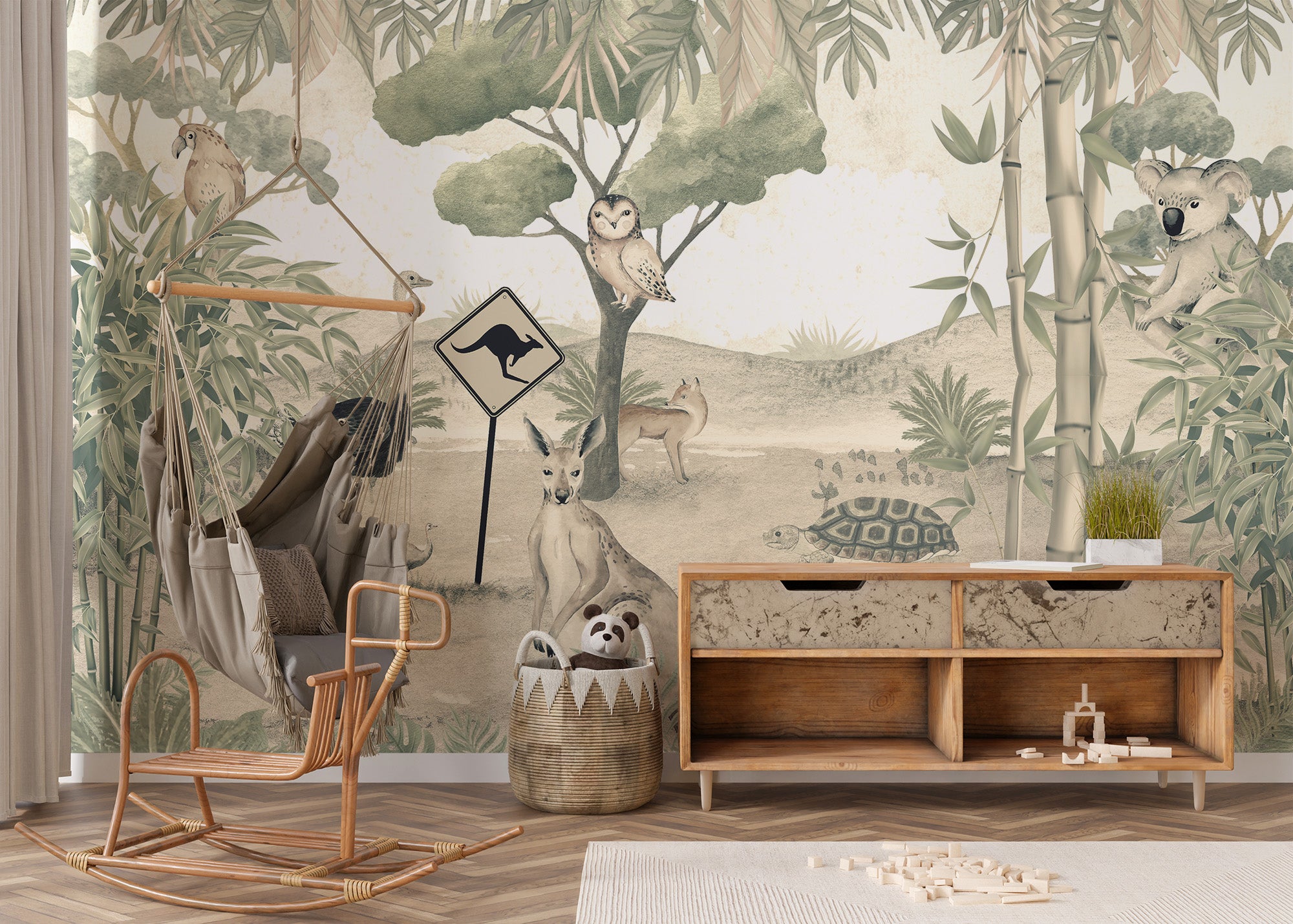 Bring the vibrant heart of Australia's wilderness into the nursery with the Aussie Fauna Fantasy Mural. This enchanting nursery wallpaper captures the imagination with its gentle illustrations of the land down udder’s cherished animals. Watch your little one's eyes sparkle with delight at the sight of cuddly koalas in lofty eucalyptus trees and the quirky kangaroos hopping through the bush. Every inch of this mural tells a story, creating a lively backdrop for countless stories and dreams. Perfect for nurturing a love for wildlife and nature, this wallpaper adds a whimsical touch while keeping the room cozy and bright. Create a haven for your child where playtime is an adventure and bedtime are soothed by the friendly faces of Australia's most beloved creatures.