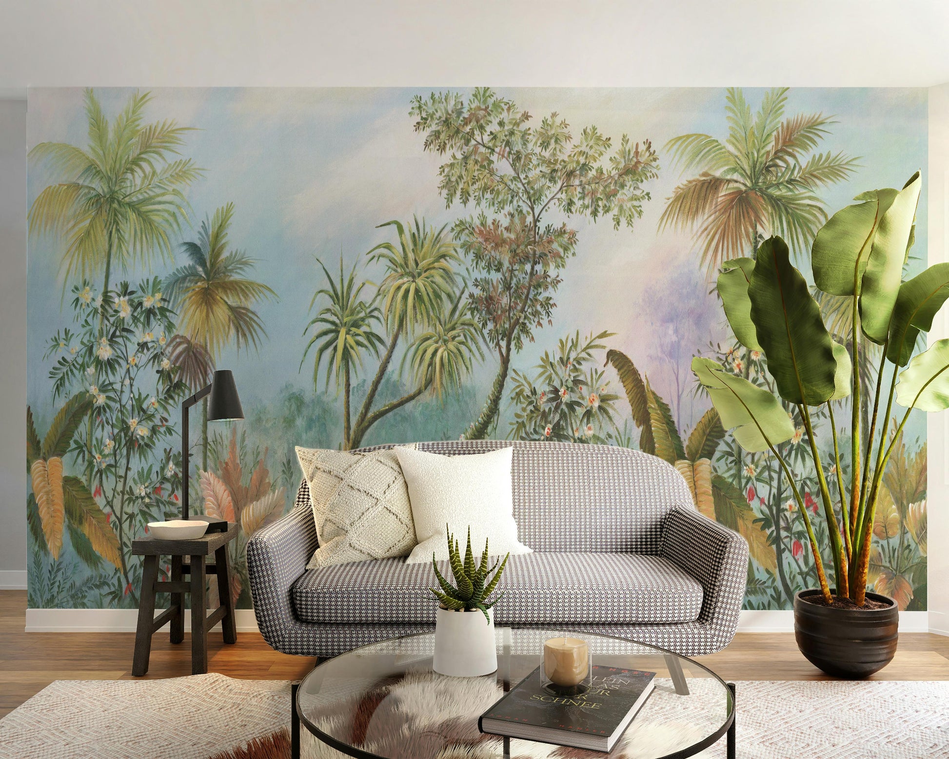 Adorn your walls with this green forest wallpaper mural and bask in the ambiance of a summery spring evening, where the gentle caress of a breeze mingles with the visual delight of toucans—a harbinger of good luck and favor. It's not just a wall covering; it's a slice of paradise that stands out from ordinary decor.