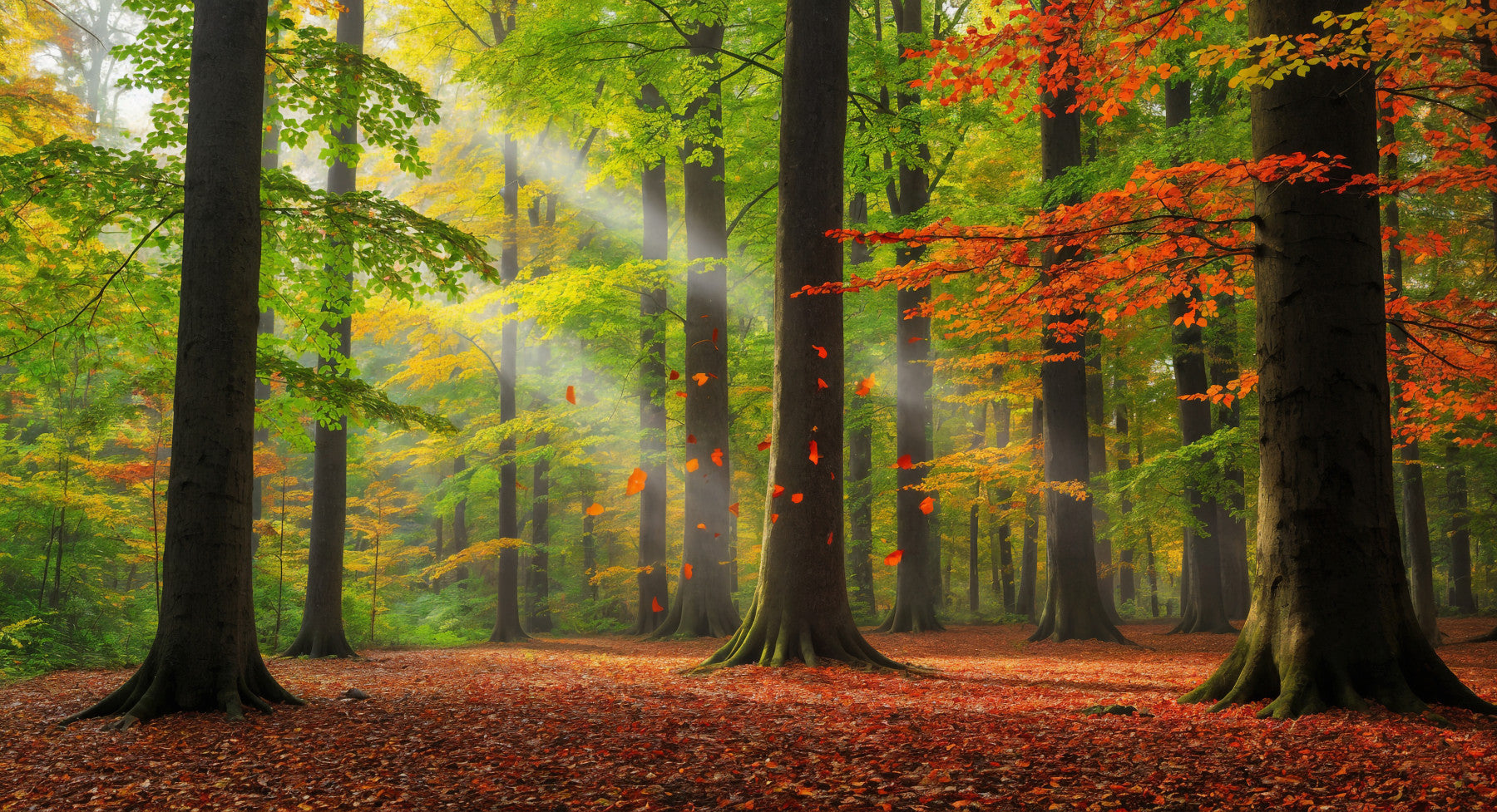 Bring the serene beauty of an autumn forest into your home. This design showcases towering trees in a spectrum of green, yellow, and red hues. Falling leaves and soft light create a calming atmosphere. Perfect for a living room, bedroom, or office, this wallpaper for walls offers an escape to nature. Let the tranquil forest scene complement interiors with a touch of seasonal charm and organic beauty, transforming any space into a peaceful retreat.