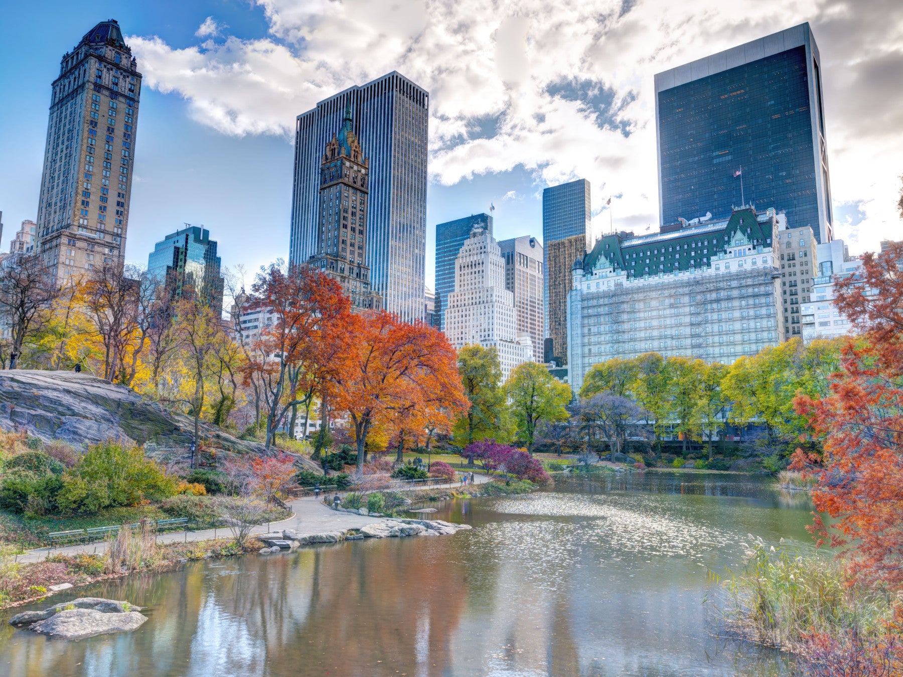 Pond at Central Park with Manhattan skyline, New York. Bring the vibrant beauty of Central Park into your home with this stunning image. The autumn foliage bursts with reds, oranges, and yellows, contrasting against the modern skyscrapers. This wallpaper for walls captures the energy of New York City and the peace of nature. It adds depth and color to any room. Perfect for a living room, bedroom, or office, the design complements modern and traditional interiors, creating a focal point that's both captivating and calming.