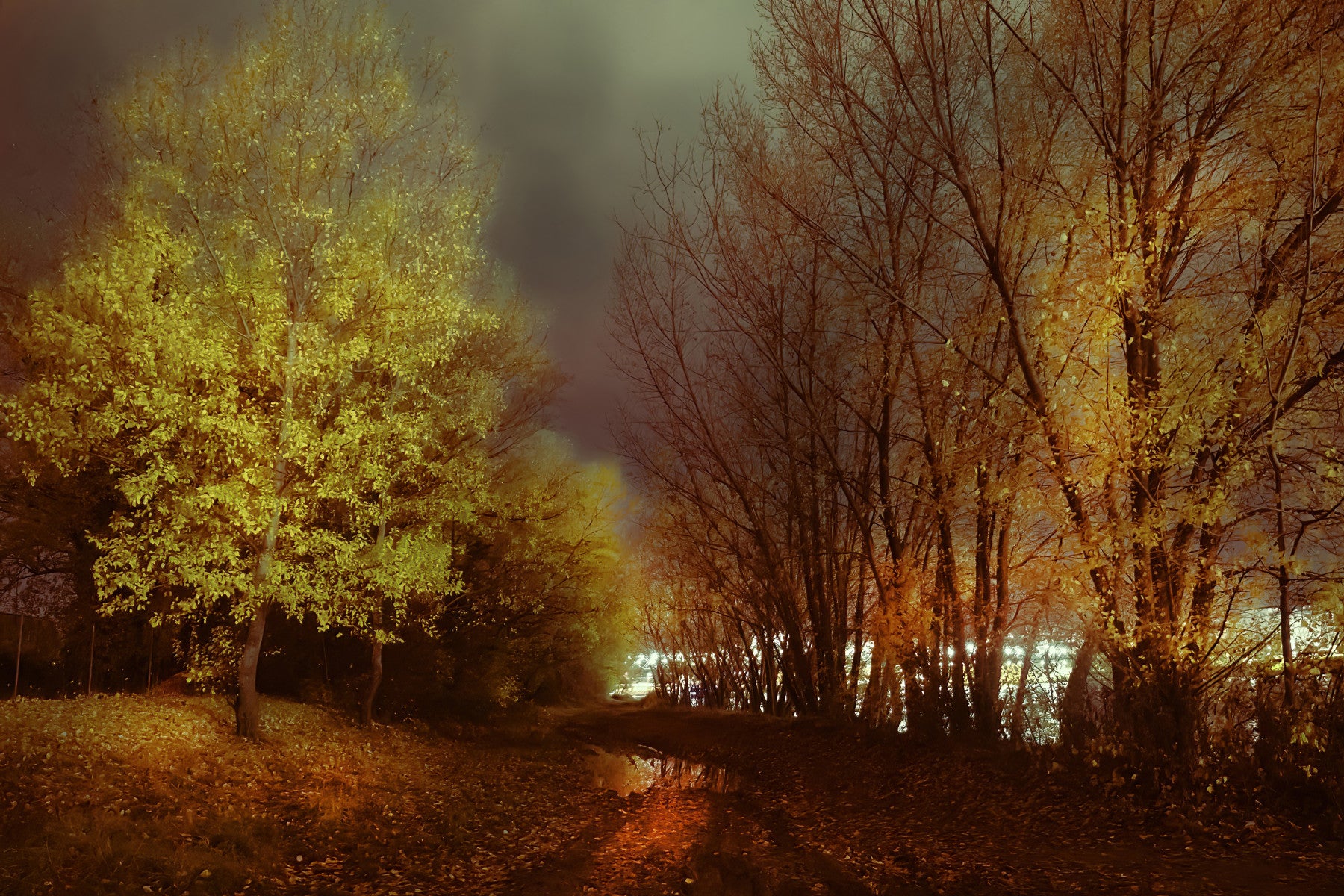 This stunning piece presents a serene autumn night scene, where trees stand tall, their leaves glowing in warm golden tones. The interplay of light and shadow reveals a tranquil path, inviting contemplation and peace. Perfect for adding a touch of nature's calm to your living space, this piece embodies the quiet charm of an autumn evening.