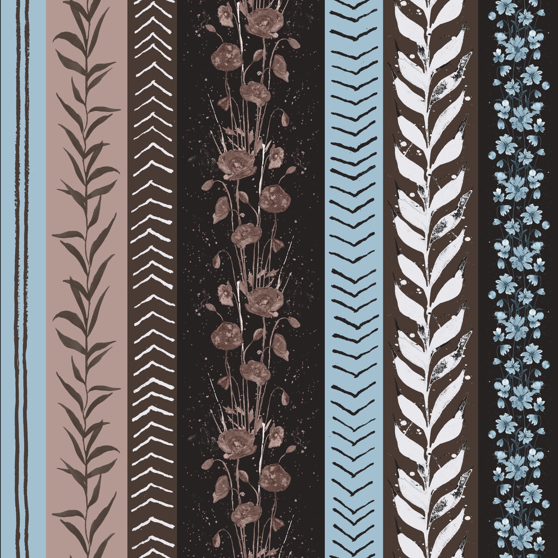 This mural wallpaper is an Autumn Stripes design, a bold wall mural with various patterns in modern copper and blue tones. It's a great wallpaper for walls for a living room, bedroom, or office. The mix of leaf motifs, abstract arrows, and delicate florals gives your space a vibrant and sophisticated feel. Made from high-quality, durable material, this mural is an easy way to refresh your home decor with a modern, colorful statement.