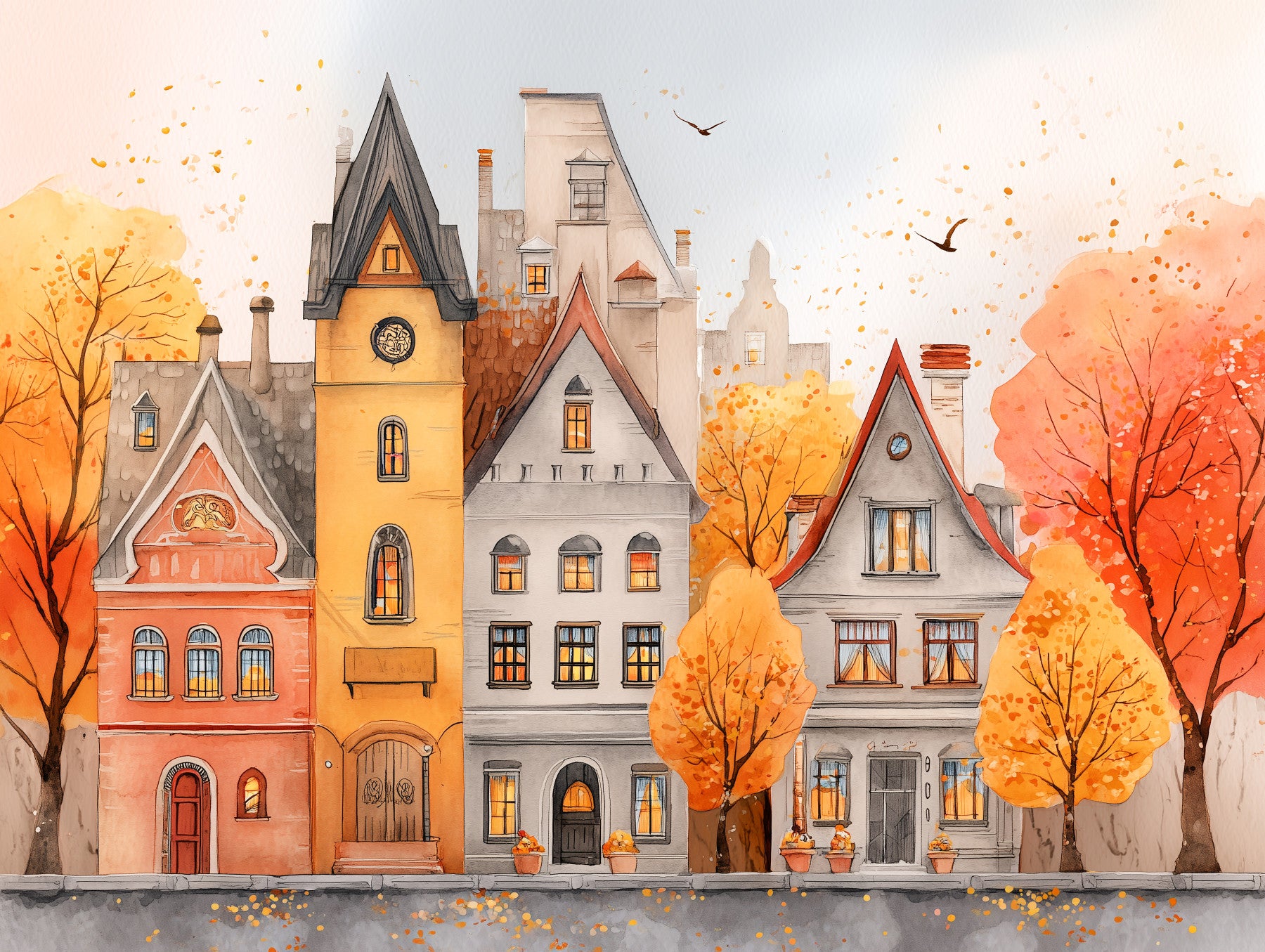 Autumn Town watercolor wallpaper for walls