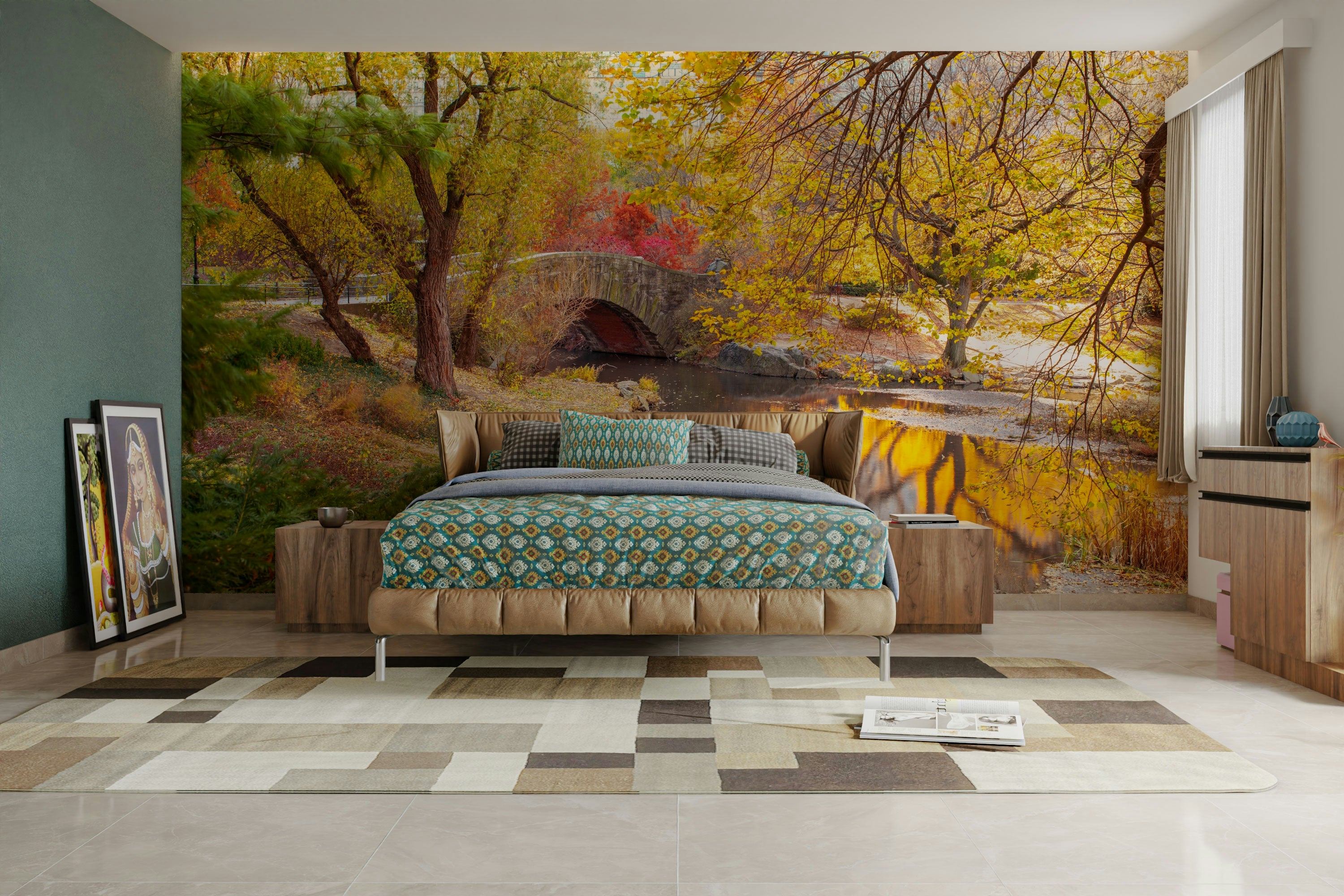 The Autumnal Elegance Wall Mural captures the serene beauty of autumn with its vibrant mix of golden, orange, and red leaves reflecting in a calm water body beneath a stone bridge. This mural wallpaper brings the cozy ambiance of a fall landscape into your space, perfect for creating a warm and inviting atmosphere. Ideal for living rooms, bedrooms, or offices, it evokes a sense of peacefulness while highlighting the beauty of nature. With its detailed design, this wall mural is the perfect way to bring the elegance of autumn indoors.