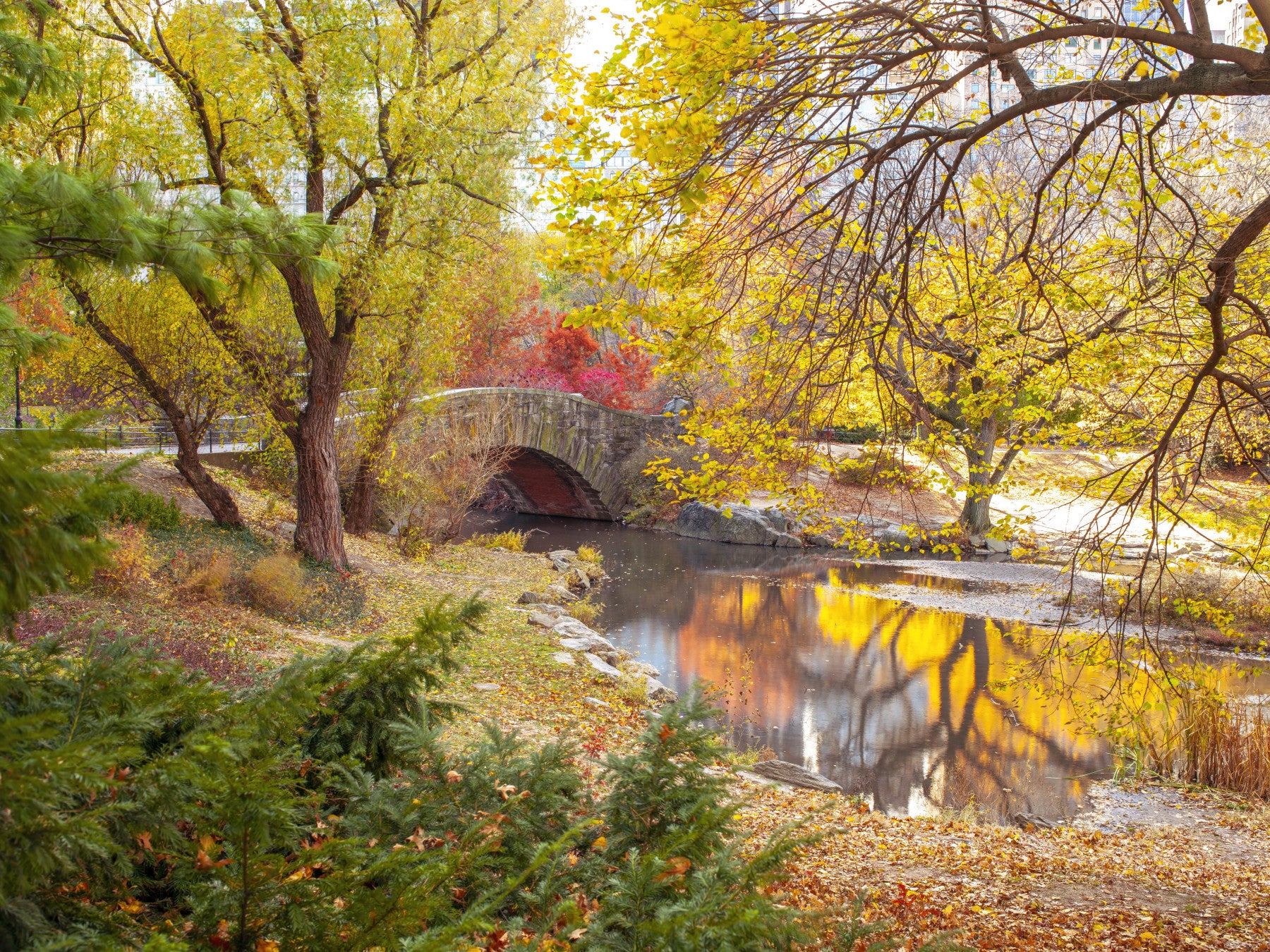 Stone bridge with reflections in calm water during autumn