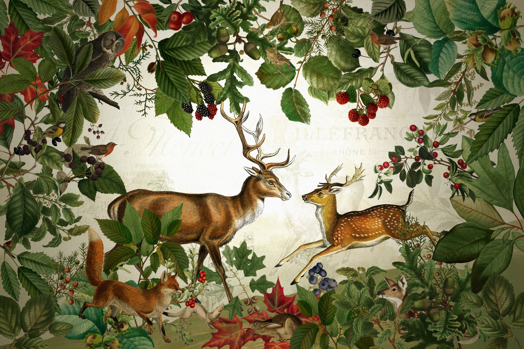 Immerse yourself in the captivating beauty of 'Autumnal Enchantment,' a wallpaper design that evokes the serene magic of a fall forest. Intricate botanical illustrations of leaves, berries, and acorns intertwine with meticulously rendered wildlife, including a majestic stag, a graceful doe, a cunning fox, and a playful rabbit. The rich palette of autumnal greens, browns, and reds creates a warm and inviting atmosphere, perfect for adding a touch of rustic elegance to any room. The vintage-inspired aesthetic and fine detailing elevate this wallpaper beyond mere decoration, transforming it into a piece of art that tells a story of nature's gentle wonders.
